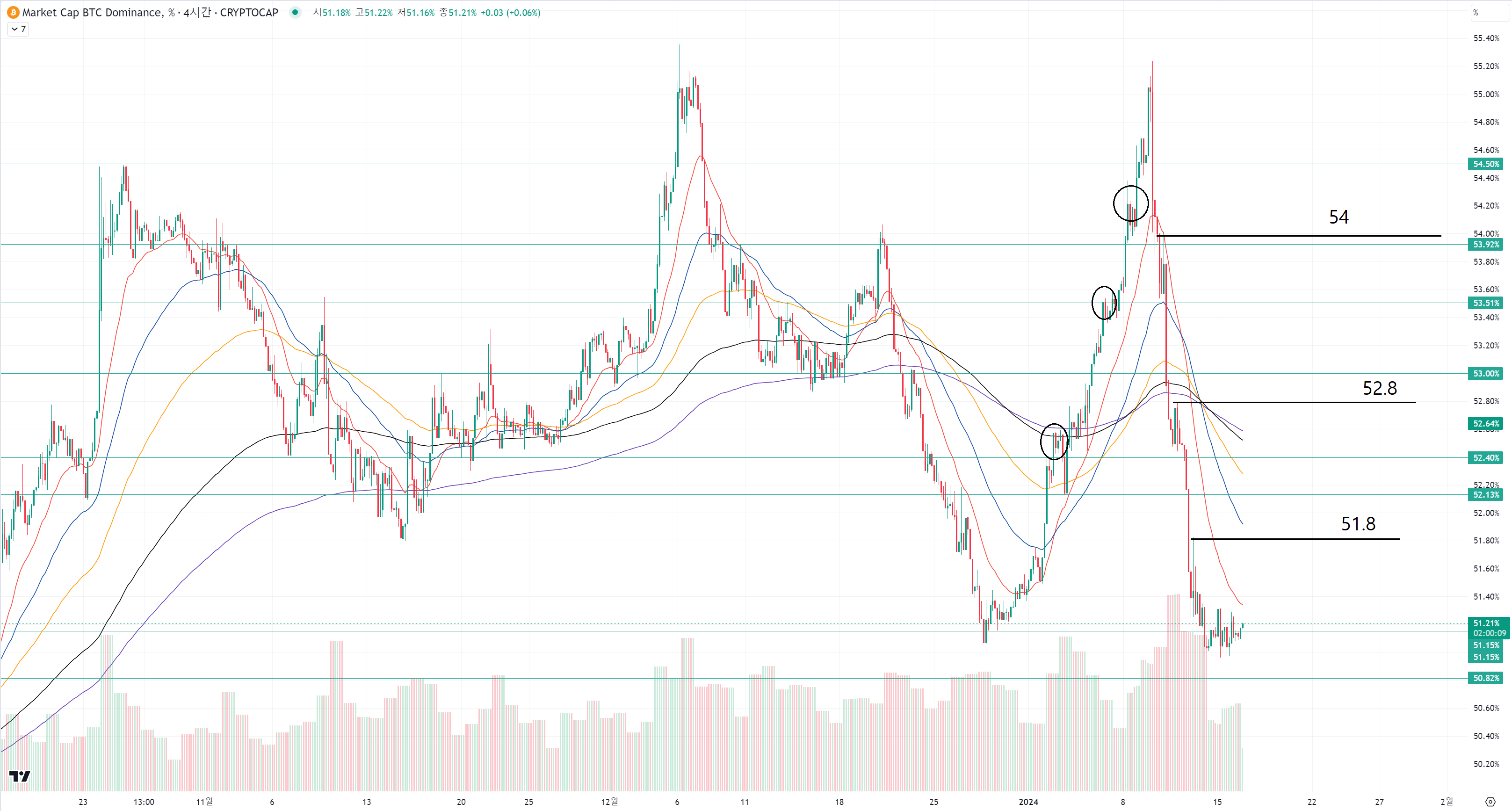 지금 저항을 기대할 수 있는 고점 부근들은 51.8 / 52.8 / 54 같은 지점들입니다.