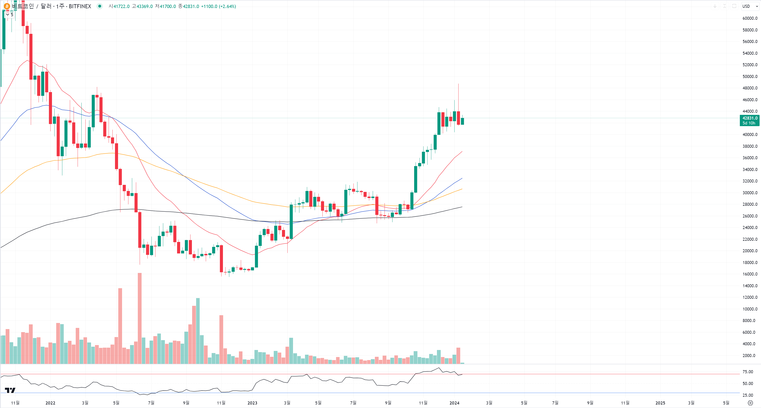 비트코인은 주봉관점에서 보면 여전히 추세가 꺽인건 없습니다.