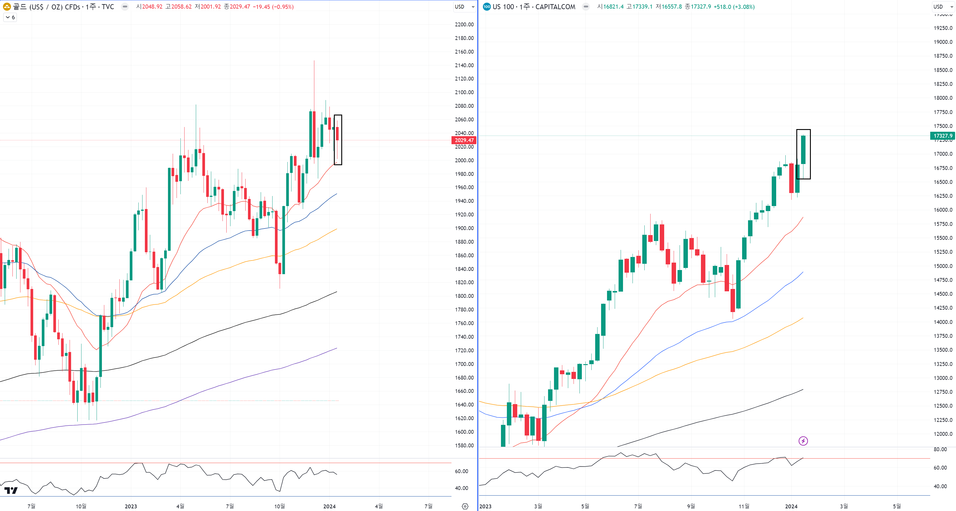 달라와 나스닥 주봉을 보면 이번주 나스닥 포함 미국 증시쪽이 전체적으로 매수세가 강했어요.