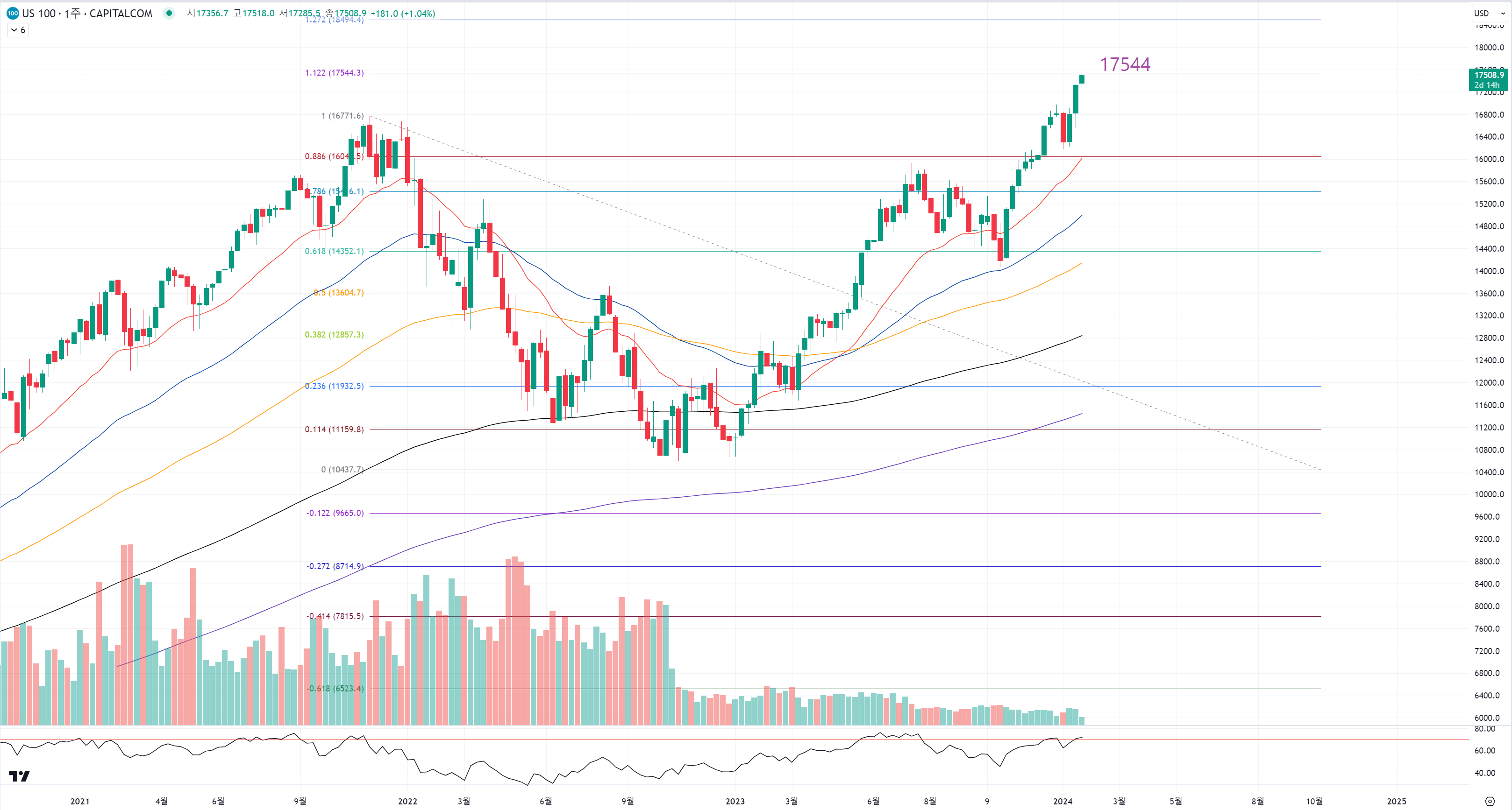 나스닥의 경우 2021년 최고점과 2022년 최저점을 기준으로 피보나치 비율을 만들어 보면