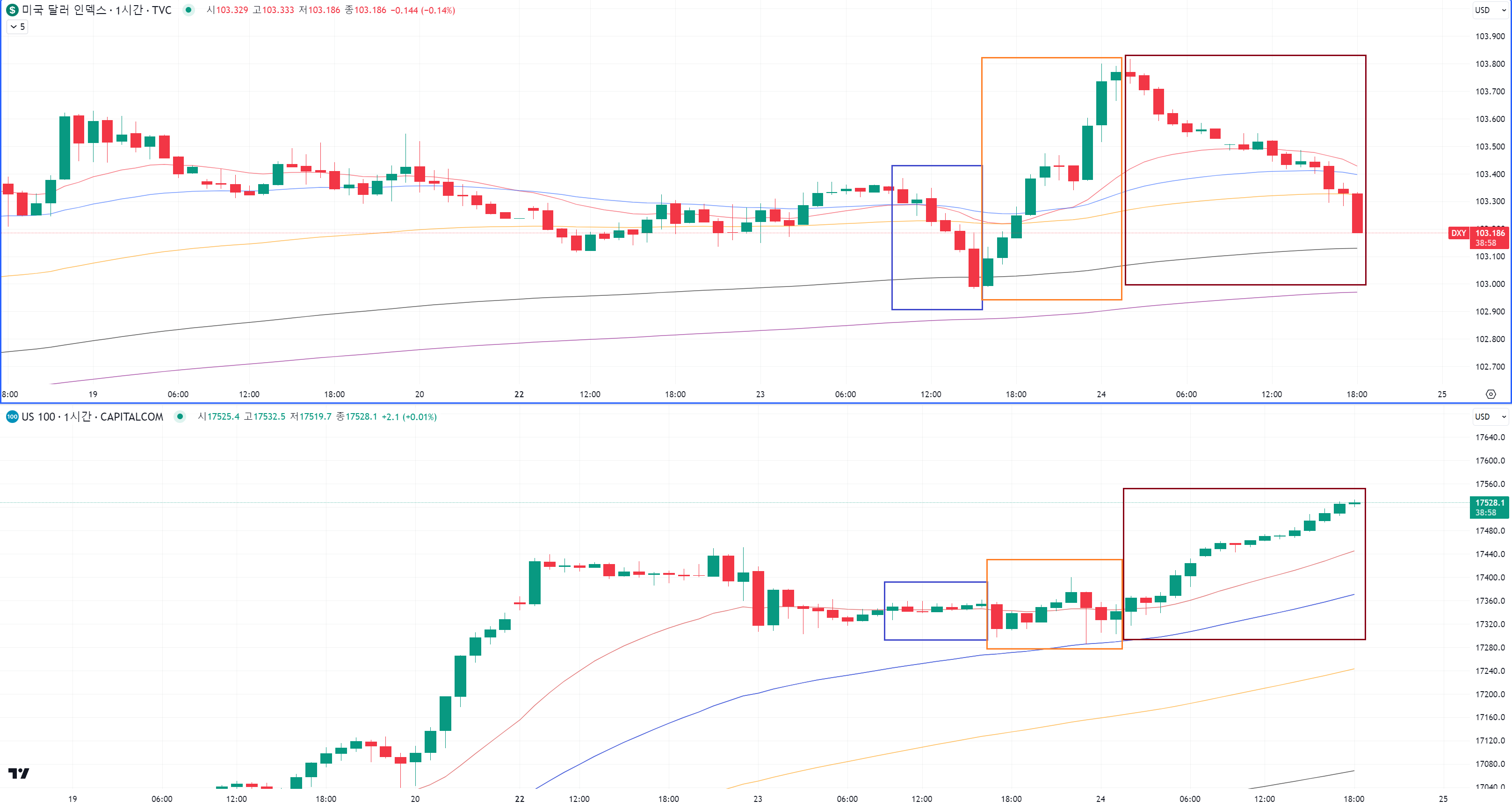파랑색 구간에서 달라 하락에서 나스닥이 상승을 못했어요.