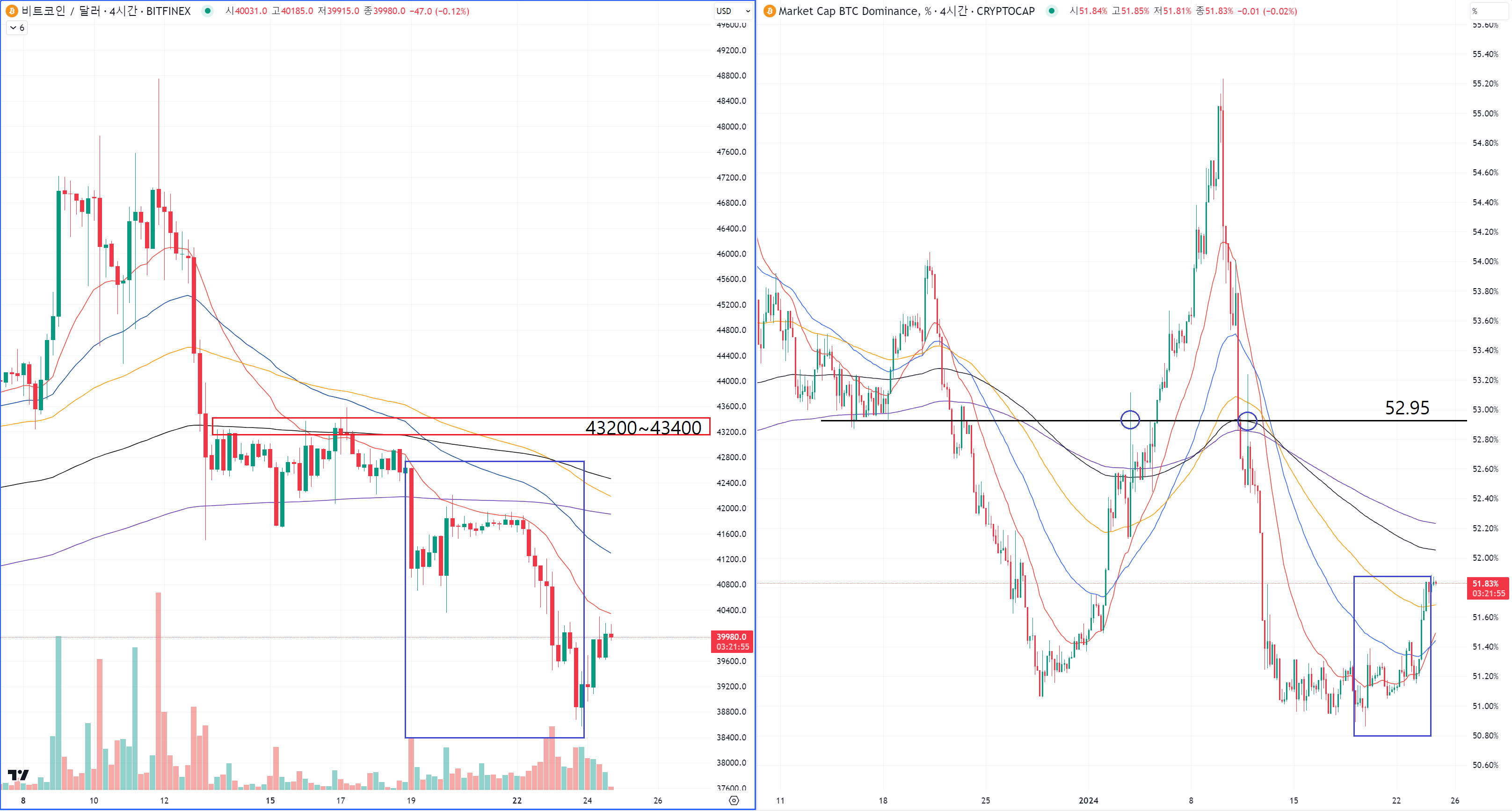 비트코인이 43200~400을 돌파하면서 도미넌스를 52.95 부근 혹은 조금 더 위까지 끌어 올립니다.