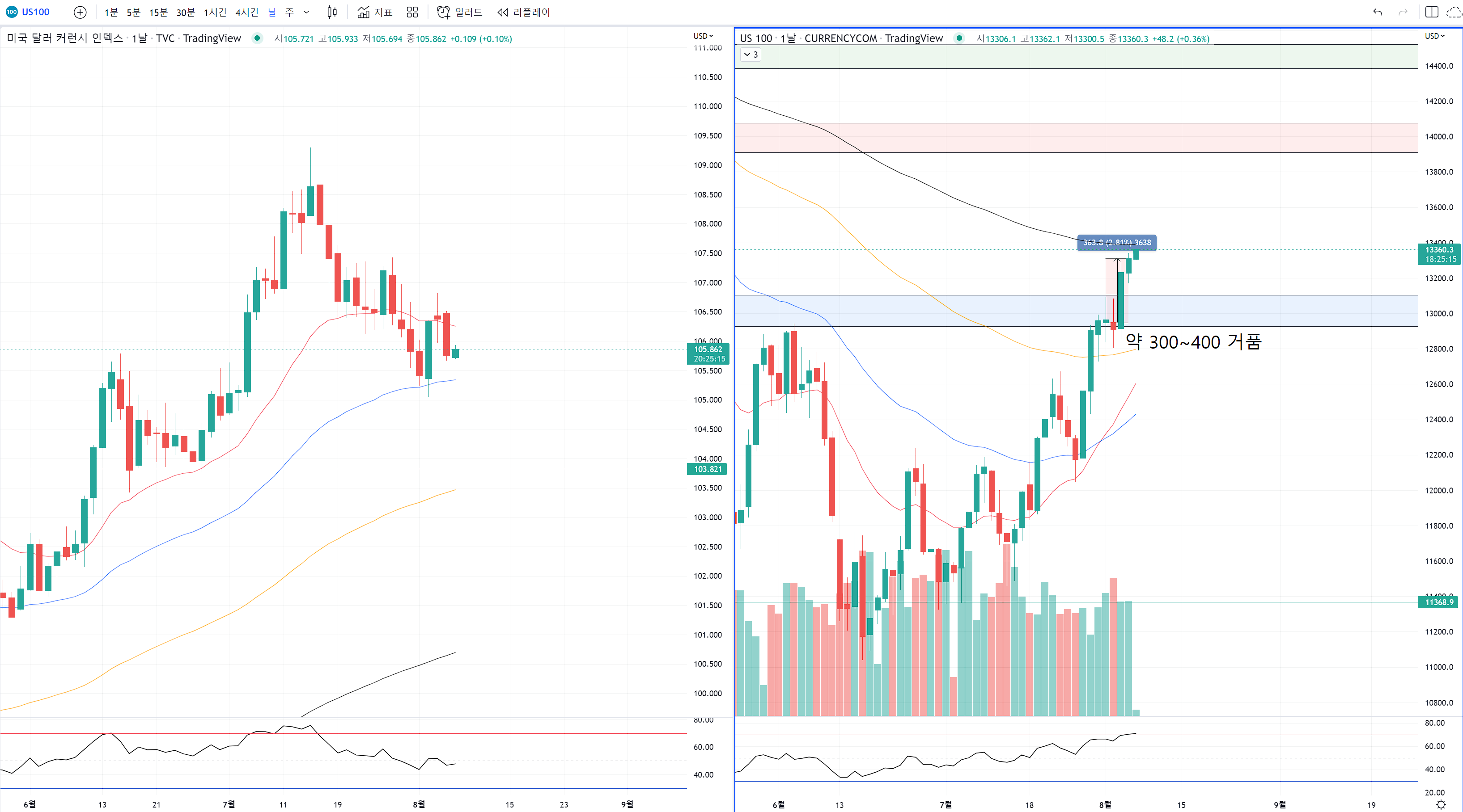 왼쪽은 달라 차트이고, 오른쪽은 나스닥 차트입니다.