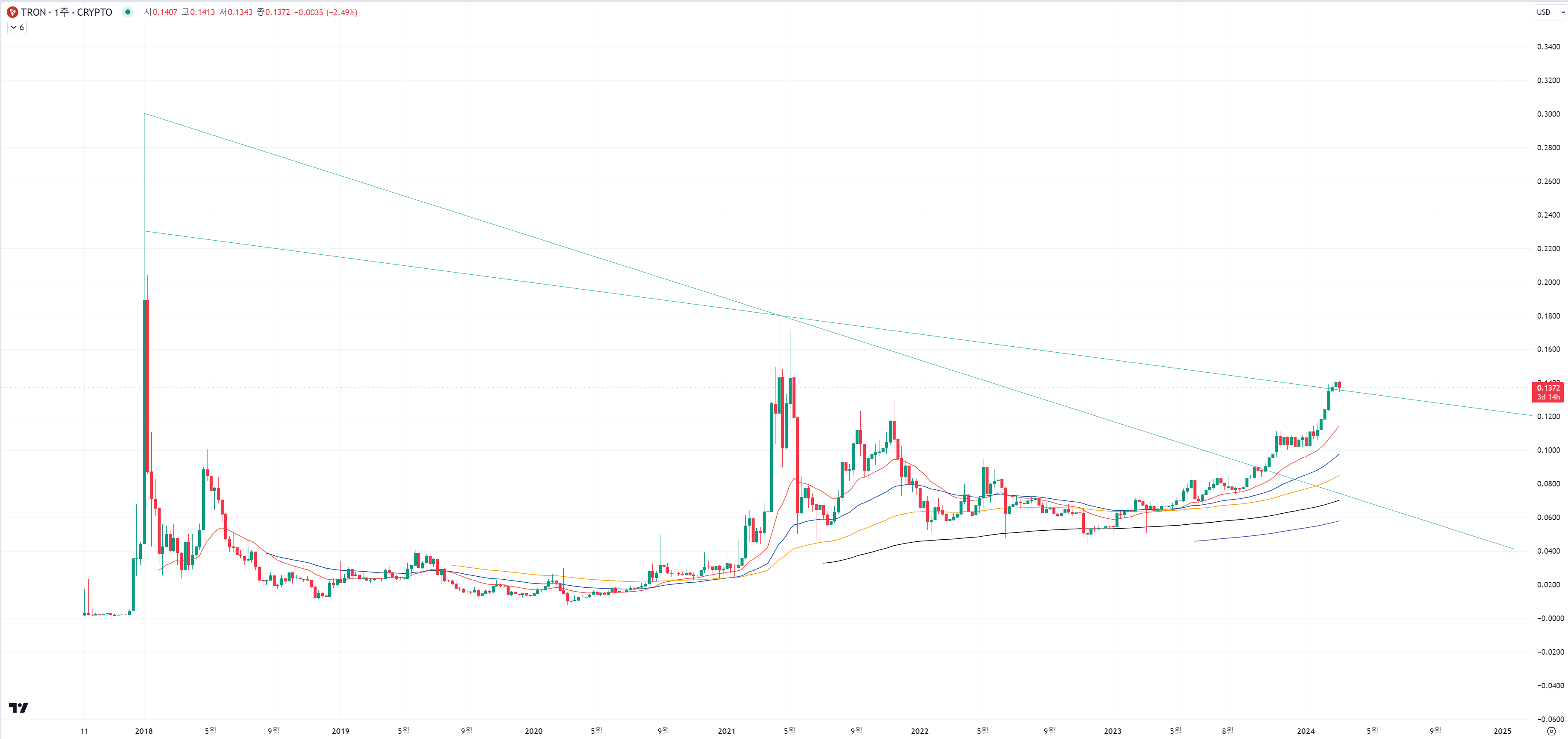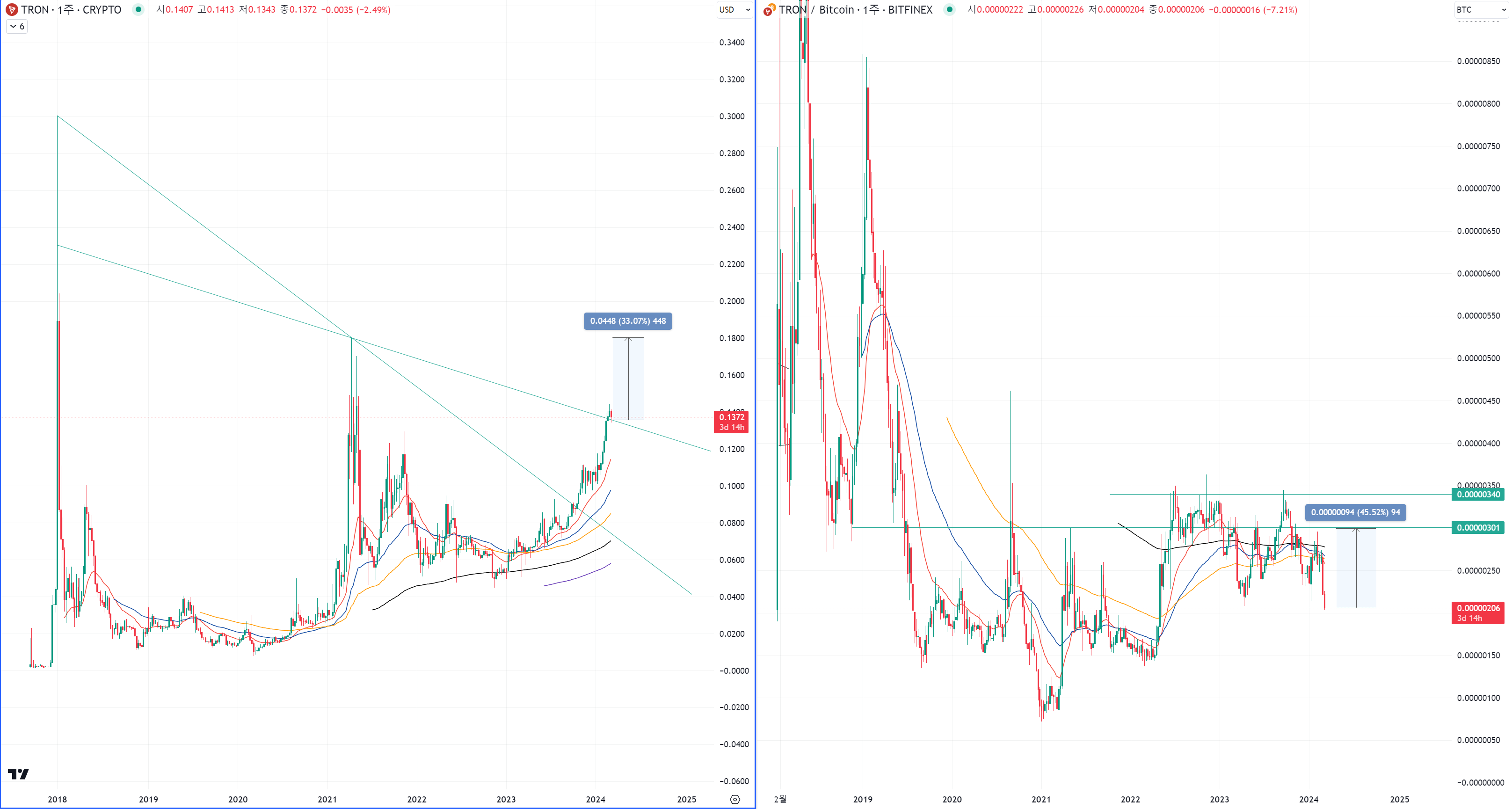 최소한 트론처럼 추세선이라도 넘기고 나서야 기대를 하며 단타로 접근하는건 괜찮습니다.