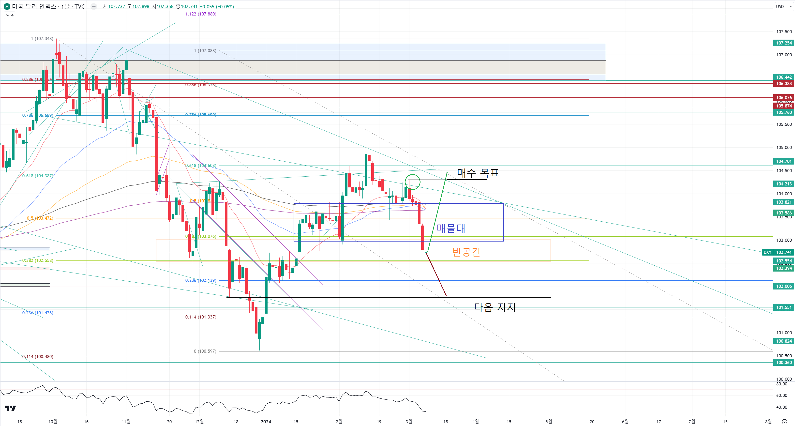 주황색 구간에서 횡보를 해준다면 증시나 금은 계속 상승세를 유지하기 좋습니다.