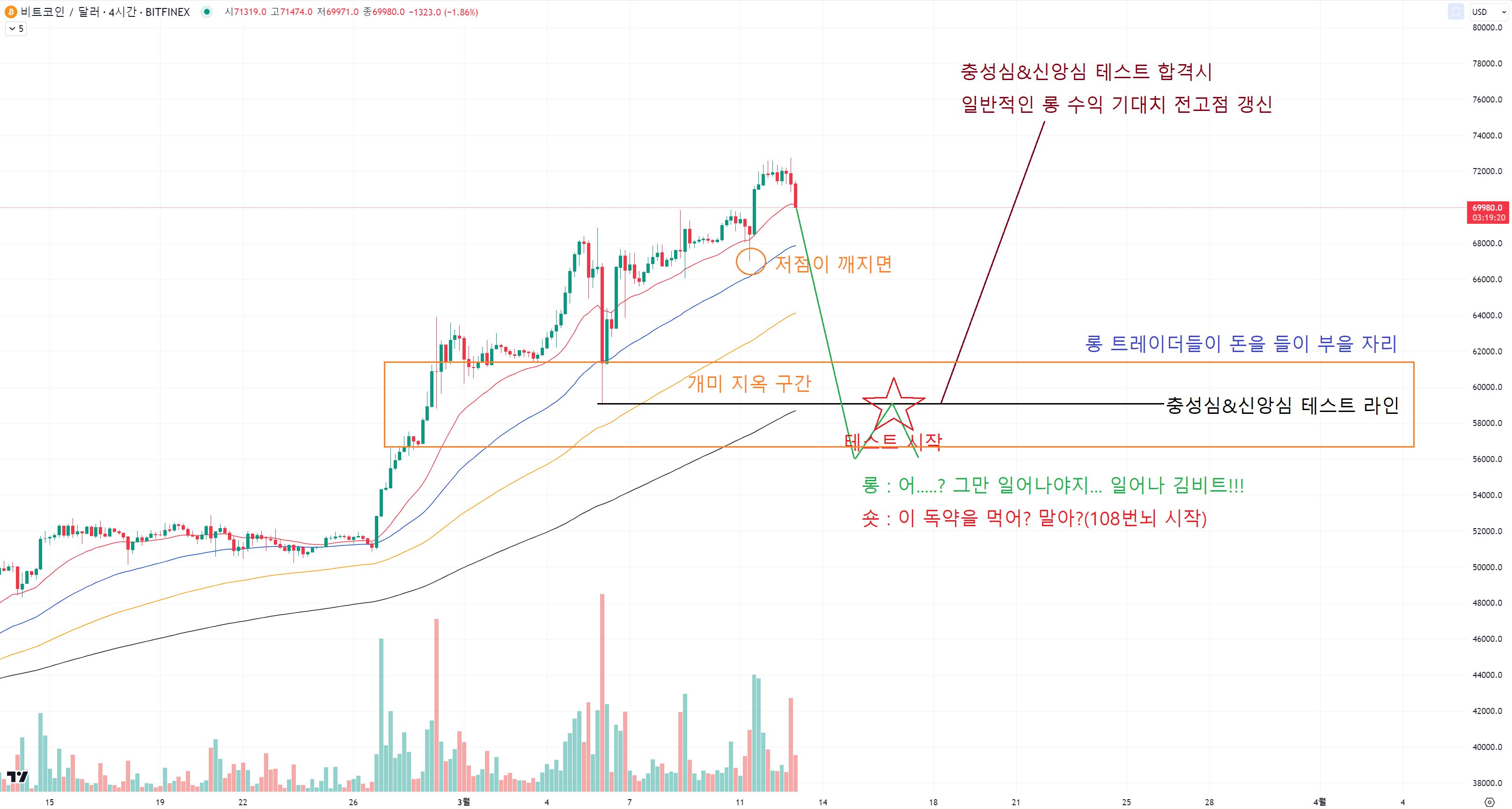 그래야 매수가 2월부터 올린 급한 상승만큼의 변동성을 고스란히 숏포지션 진입자들이 수익 기대치로 노릴 수가 있습니다.