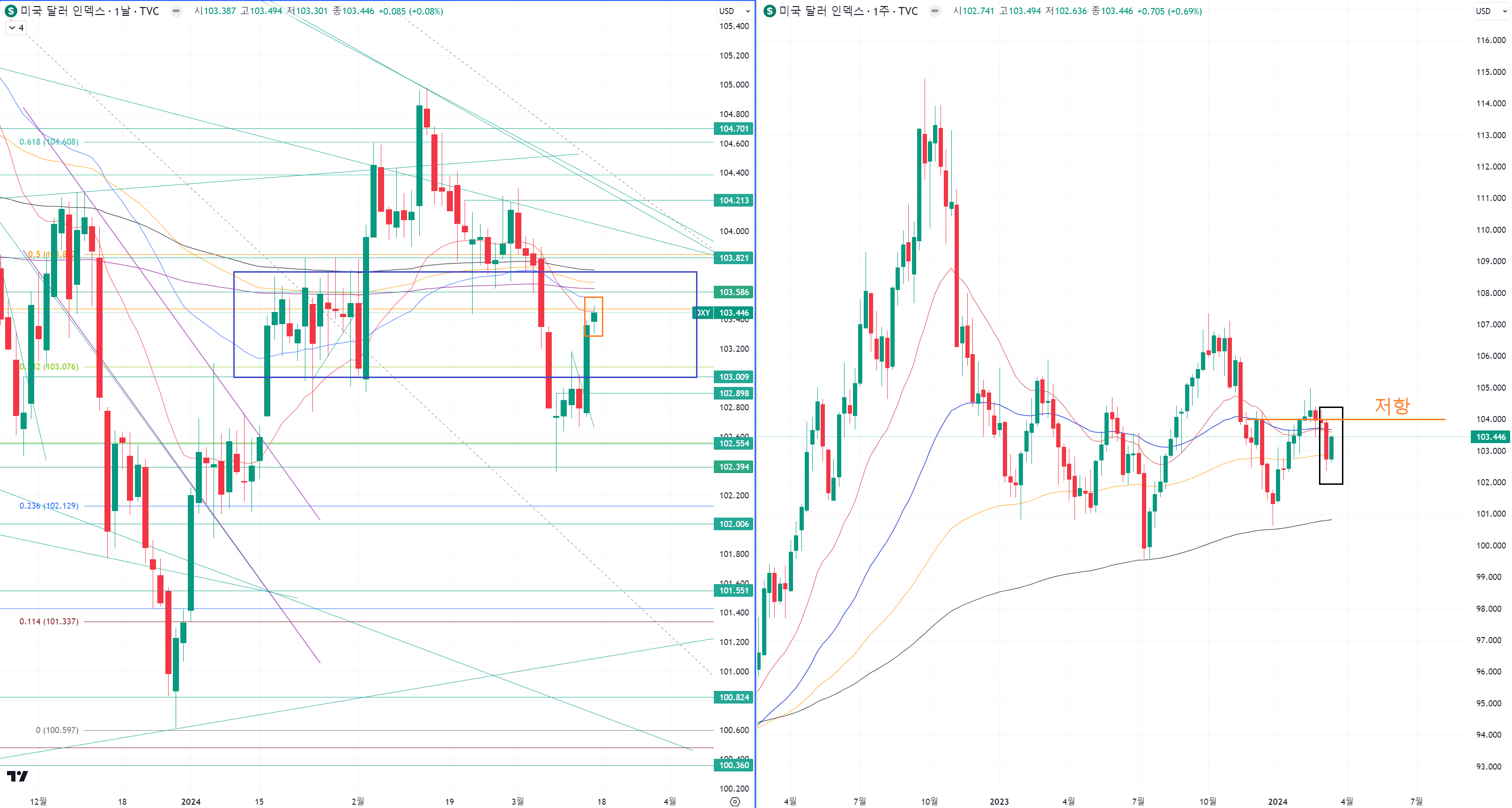 파랑색 매물대를 돌파해도 주황색 104 부근의 저항도 있습니다.