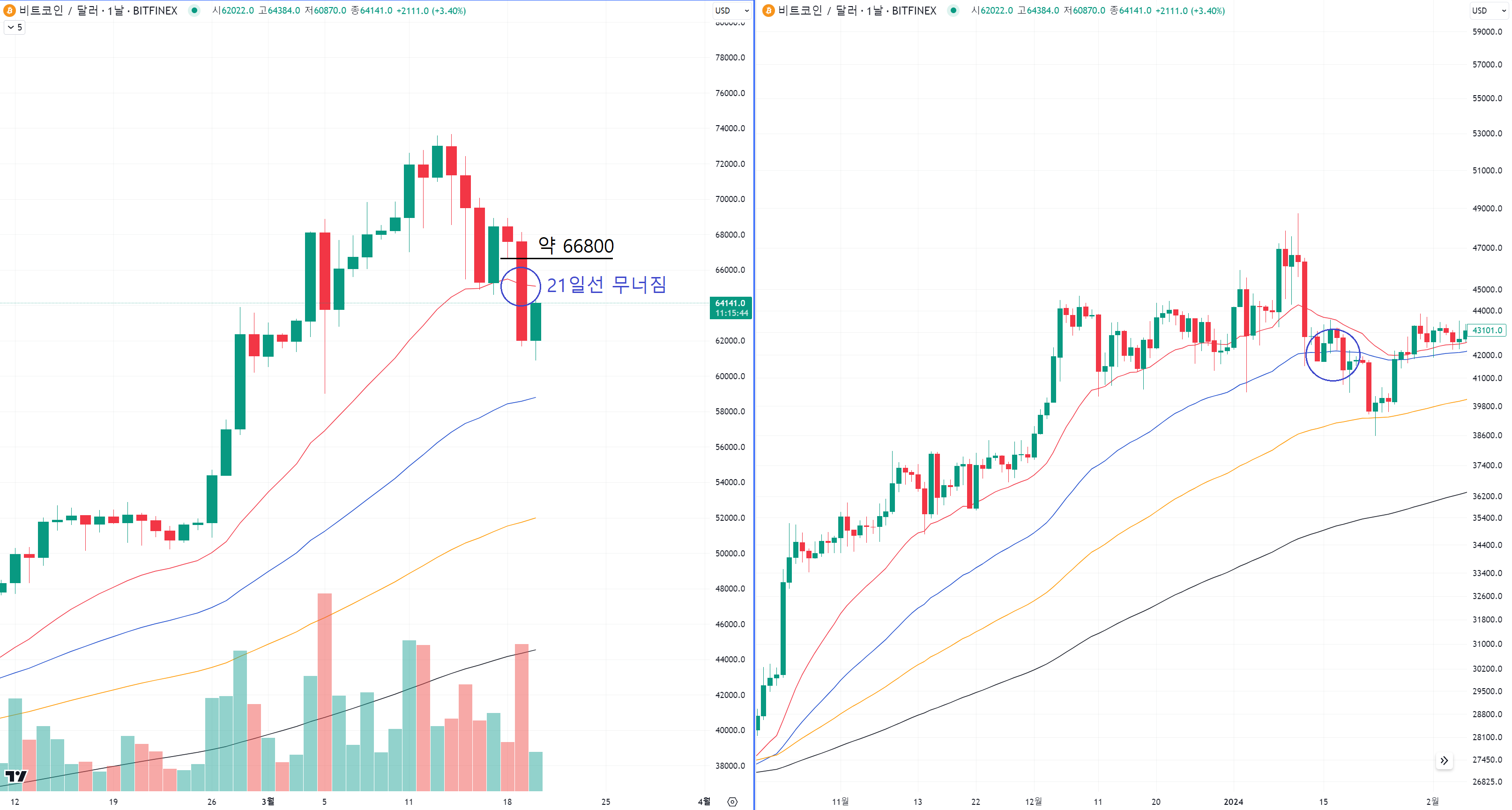 비트코인은 상승추세를 아무리 잘받아도 이평선에서 21일선이 무너지면 한동안 횡보장으로 가는 경우가 많았습니다.