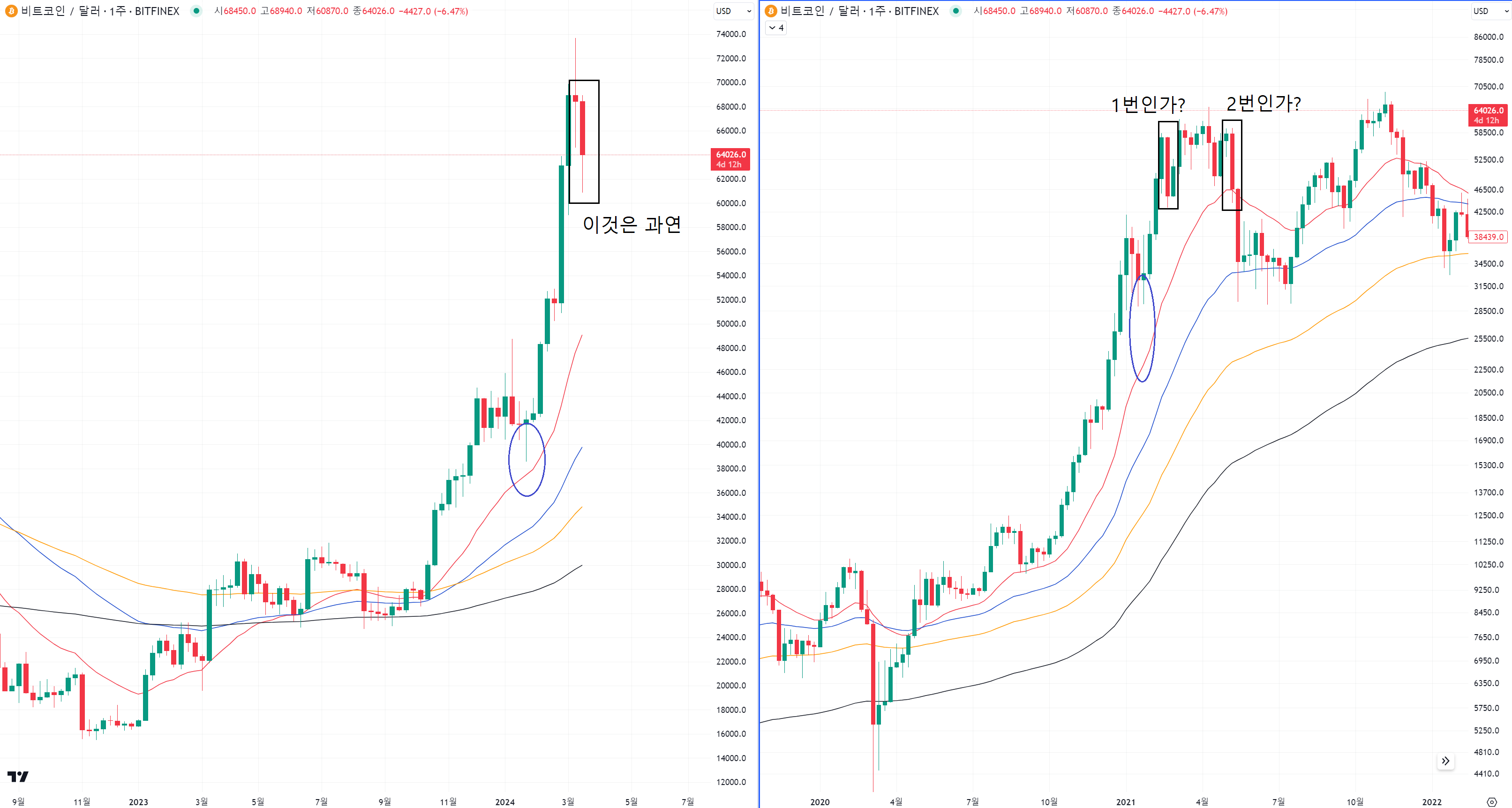 왼쪽이 현재 주봉. 오른쪽은 2020~21년 주봉입니다.