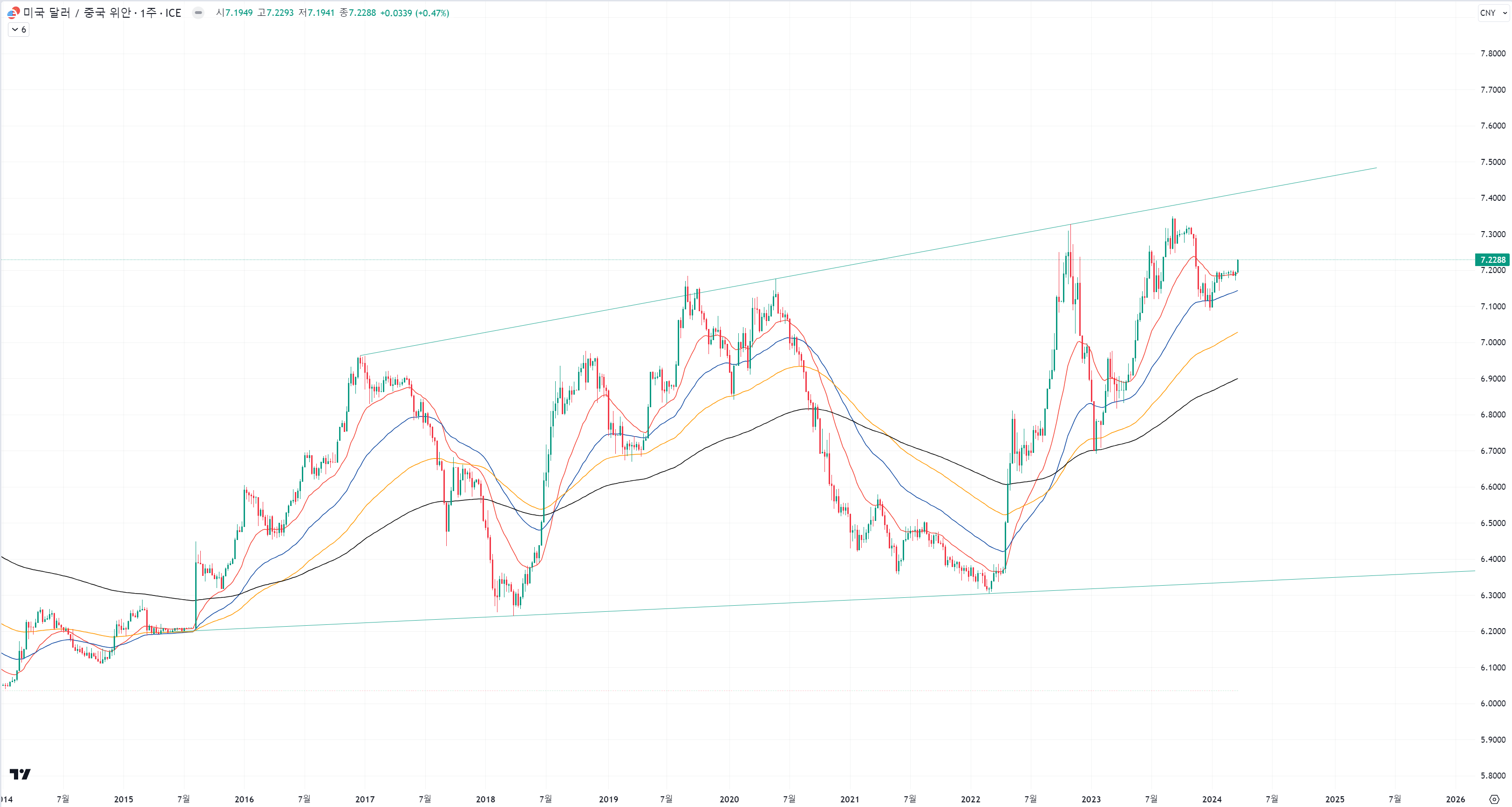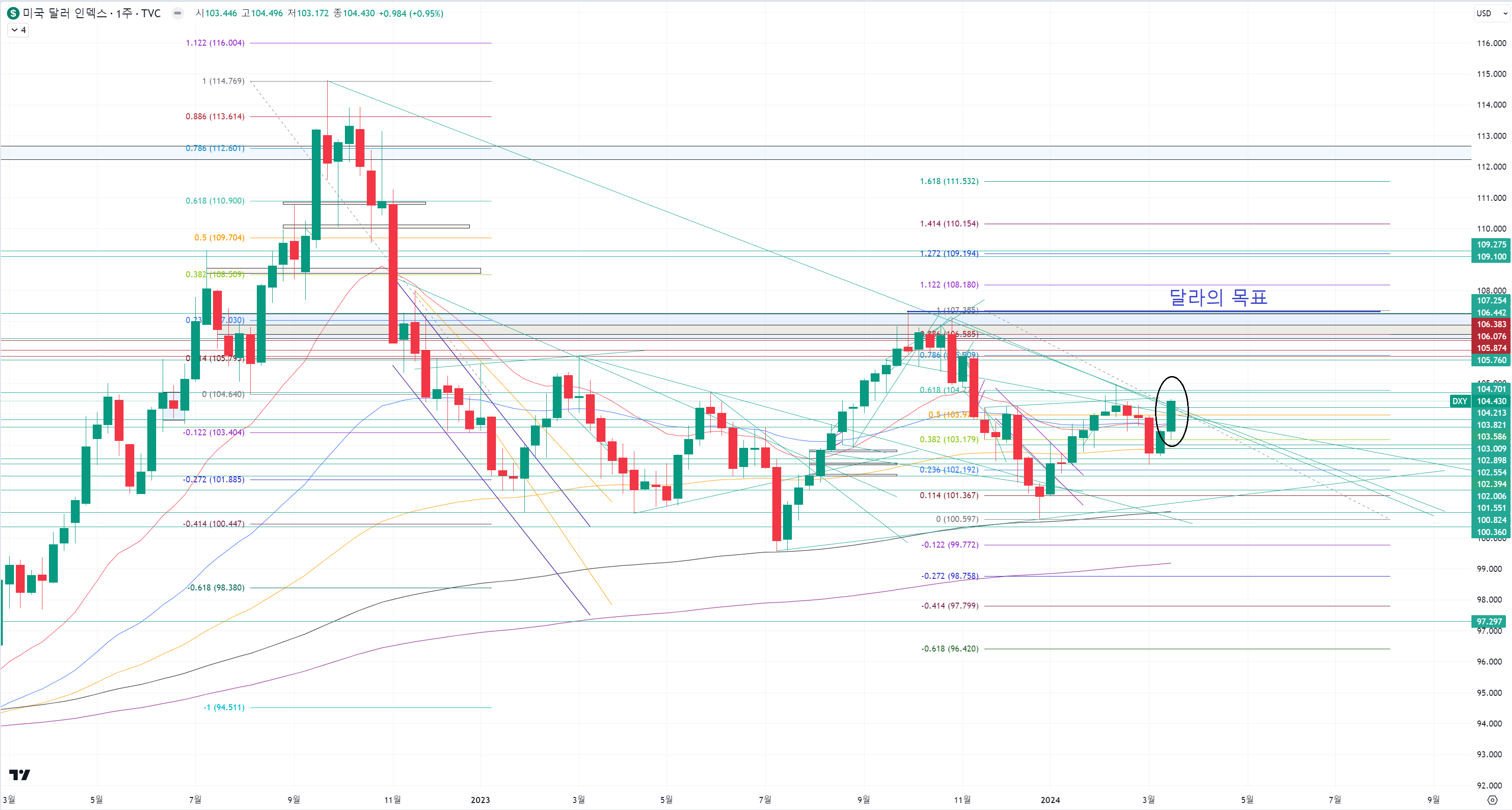 달라가 주요 추세선을 주봉에서 다 넘어갔습니다.