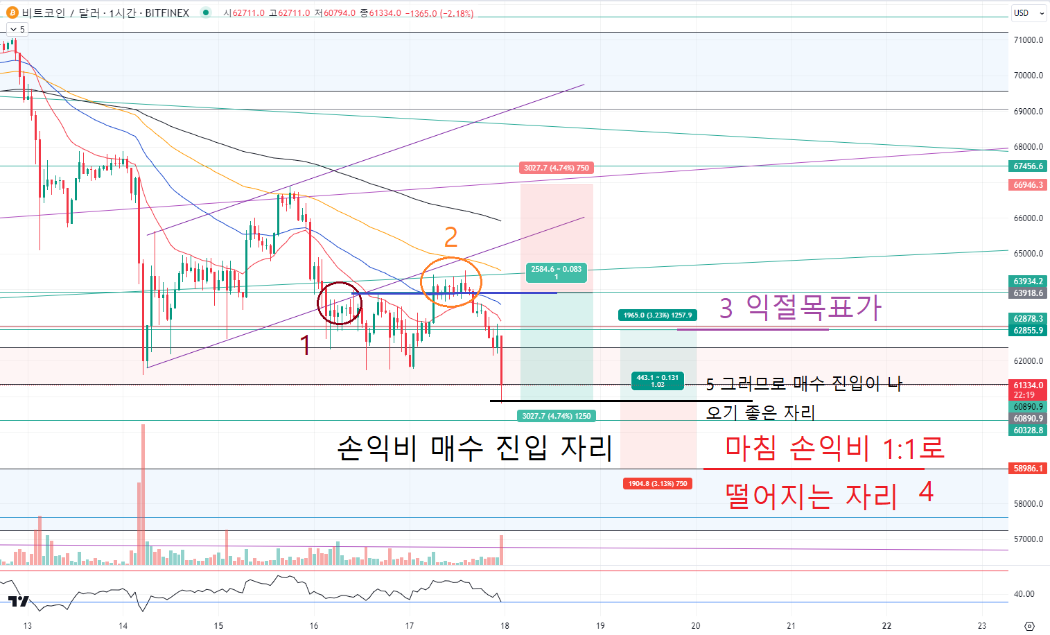 이전 고점까지를 손절범위로 잡고 1:1기준 익절 범위를 잡으면 60800~900이 됩니다.