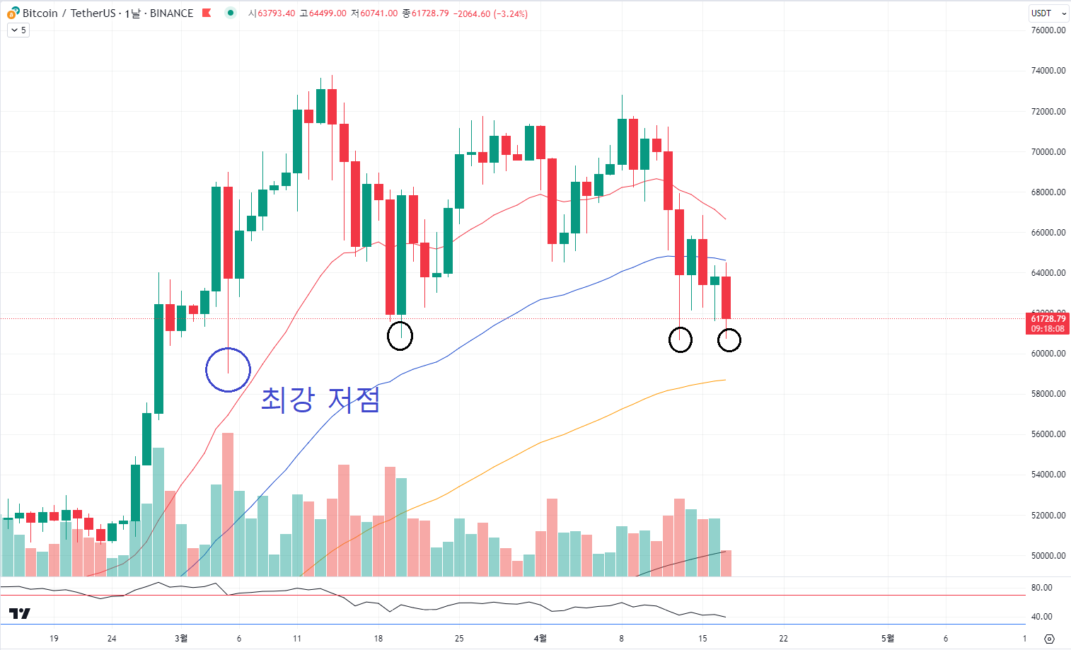 파랑색 동그라미인 최강 저점이 깨진 이후 반등 자리입니다.