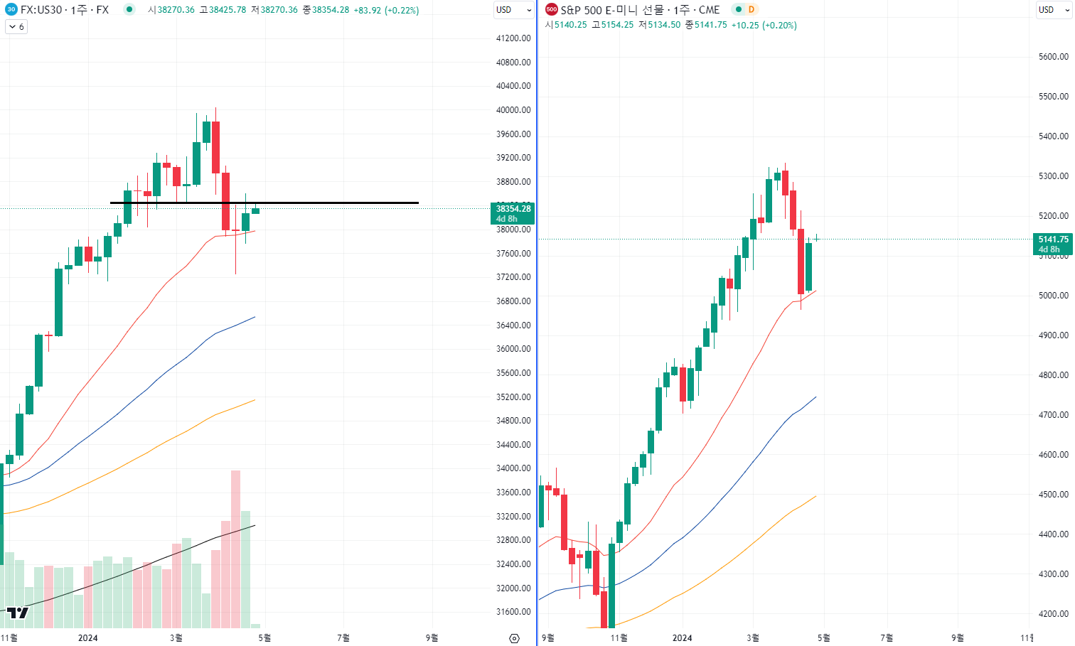 특히 다우에서 중요 자리 저항이 뚜렷하게 보입니다.