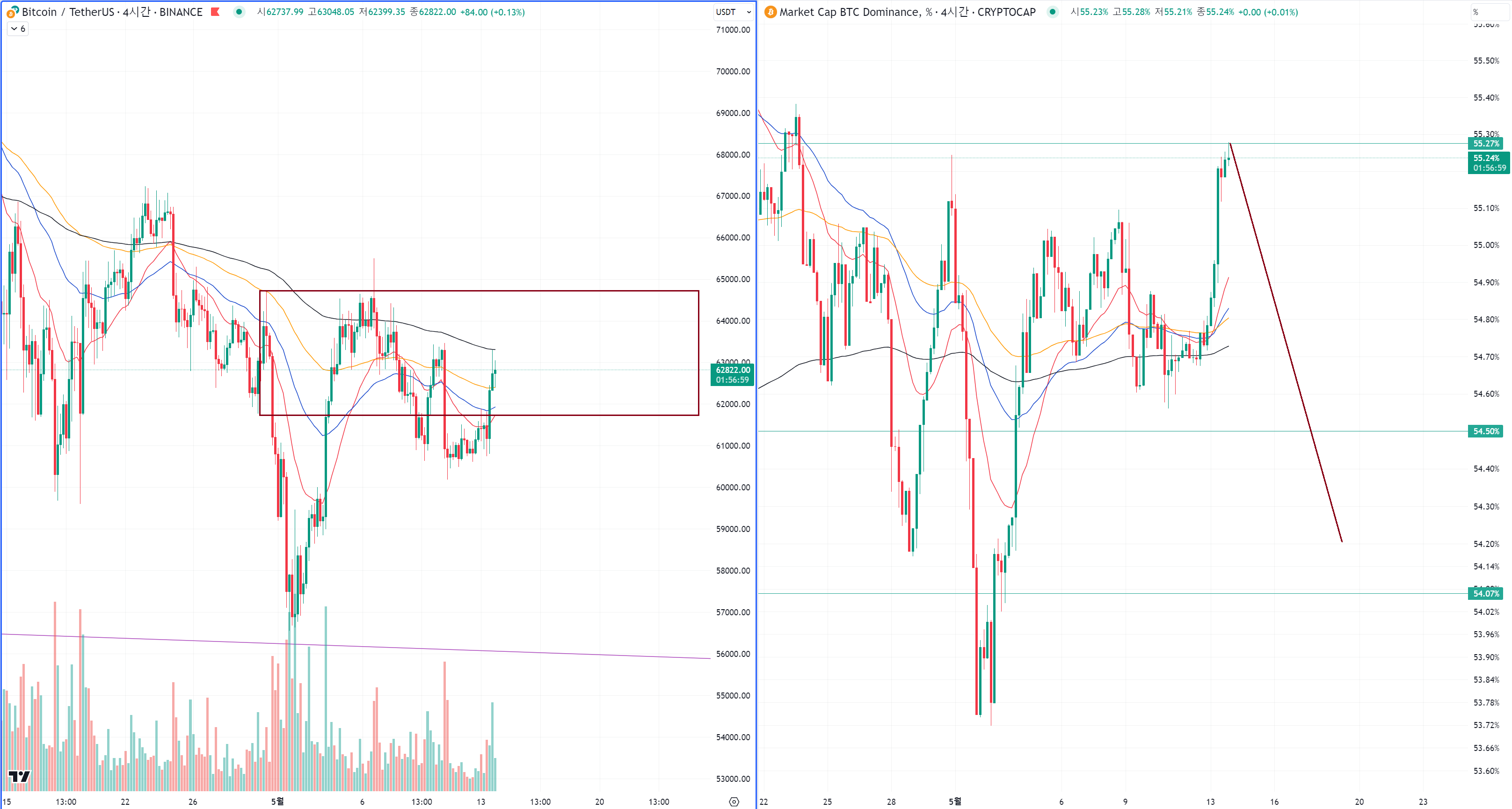 이 위치에서 비트코인 상승으로 도미넌스가 더 오르는건 상관없습니다.