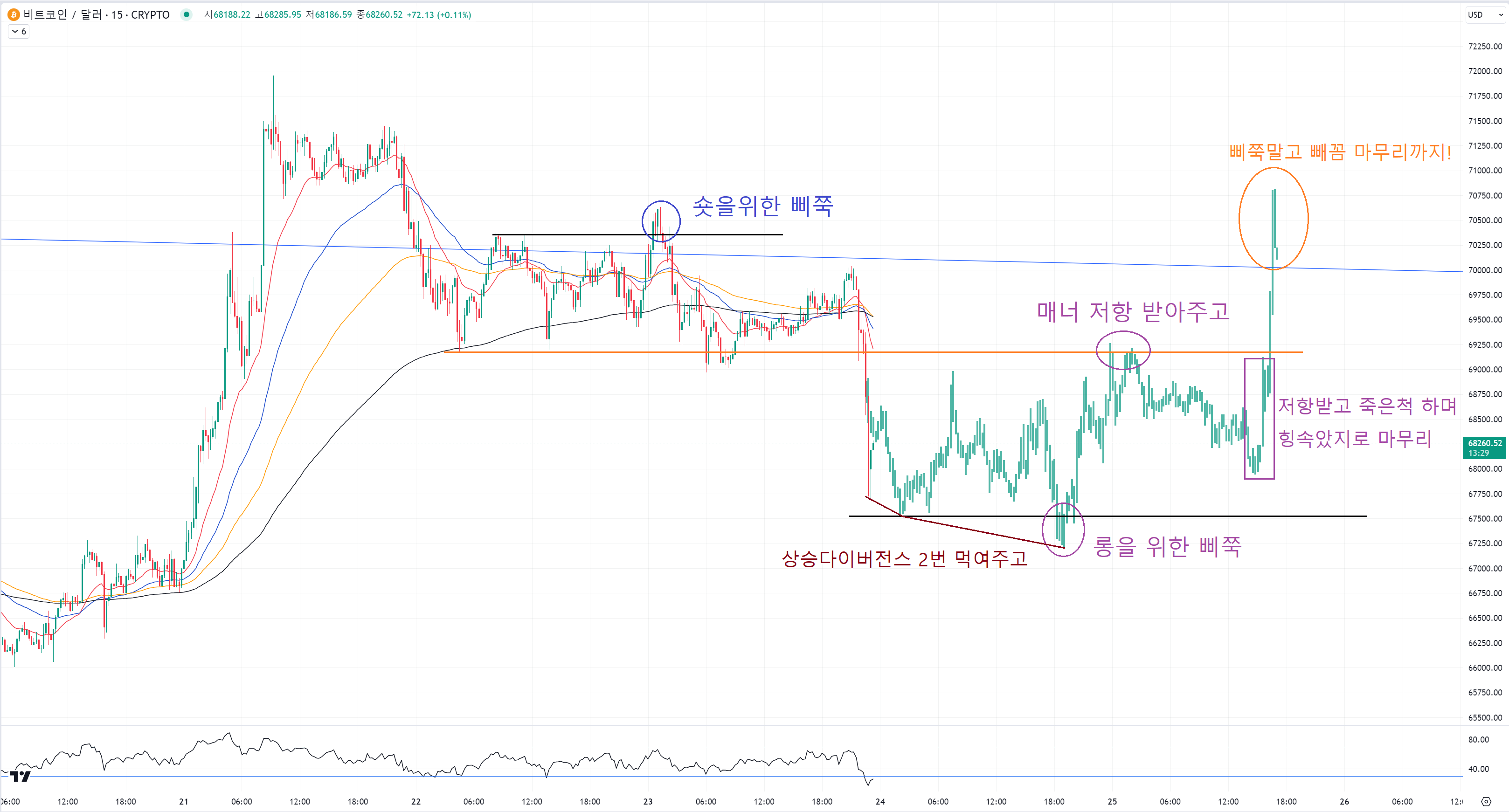 그걸 각오하더라도 보라색 동그라미 매수 진입을 할 수 있어야 합니다.