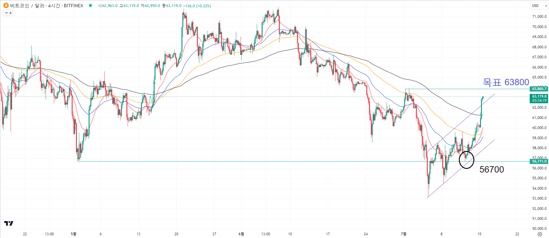 이 부분은 56700을 지켜준 시점에서 위쪽을 먼저 리테스트 해주겠구나 생각해보면서