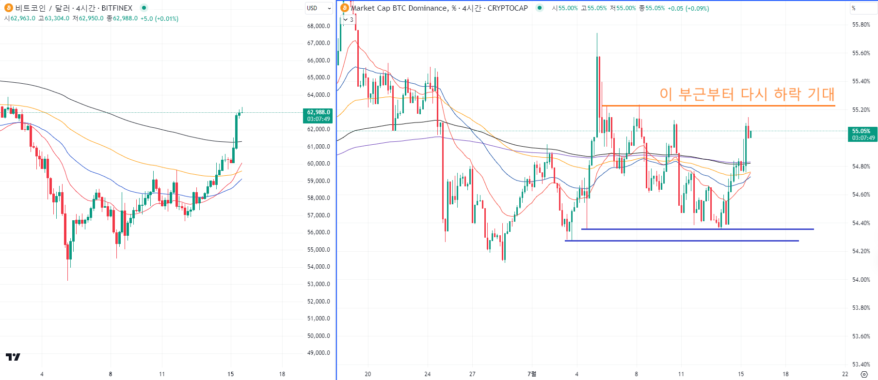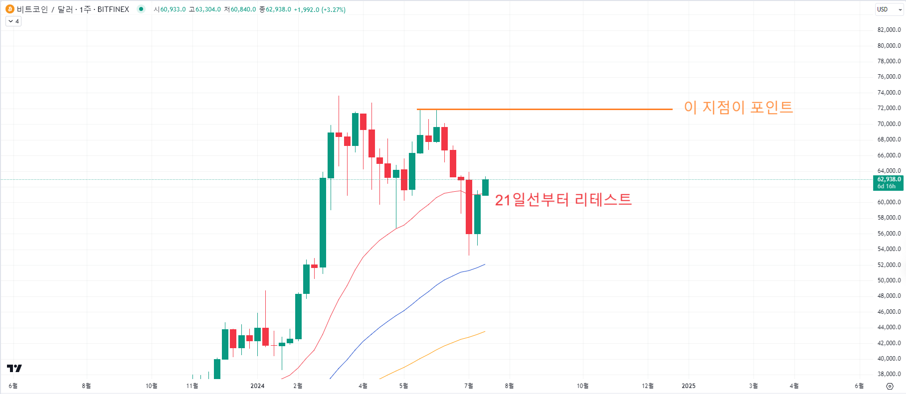 오히려 주황색선 부근에서 다시 하락을 할때 비트코인이 하락을 하는게 최악입니다.