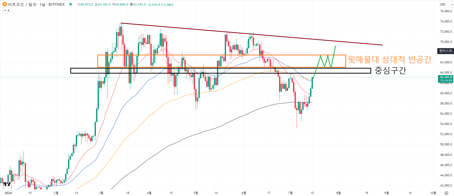 윗 매물대에서도 그나마 비어있는편인 주황색 공간에 안착하면서 횡보해주는 걸 생각할 수 있습니다.
