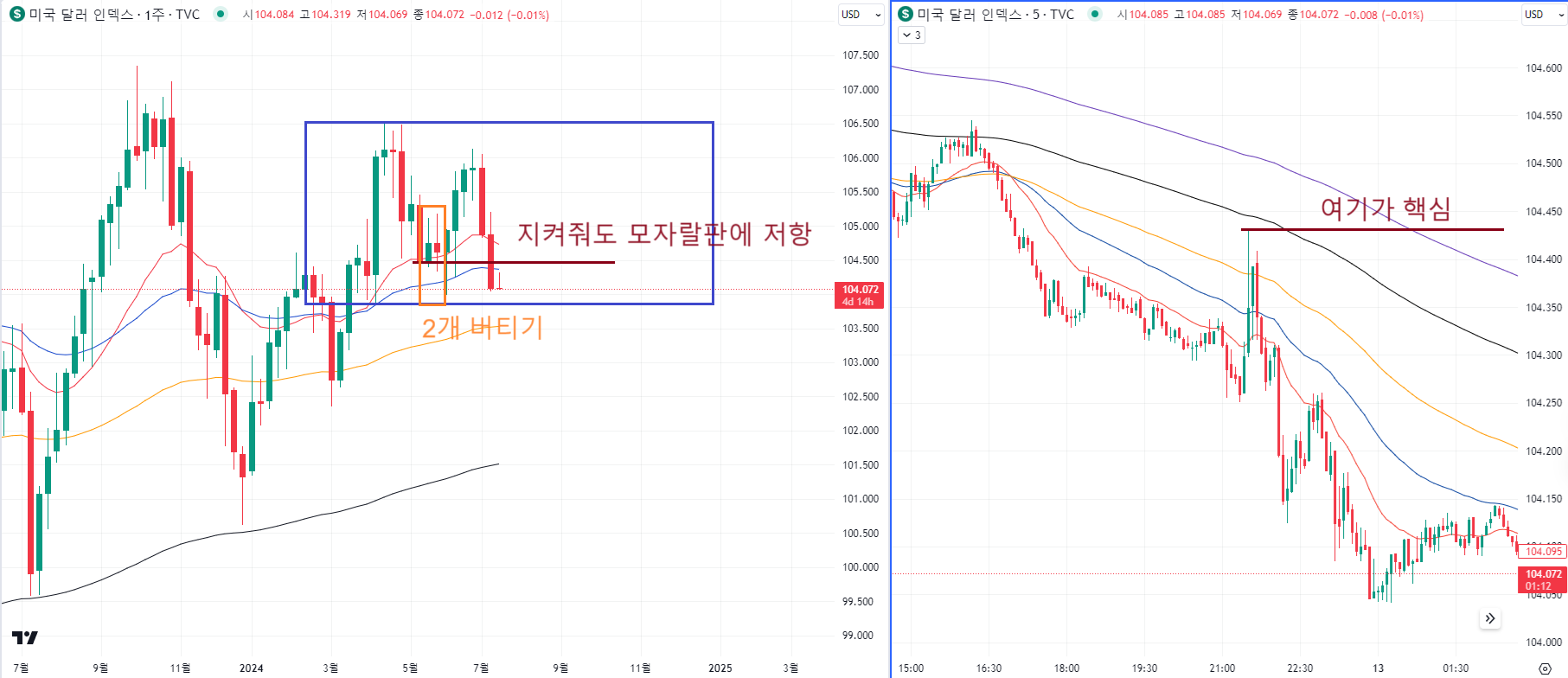 이 버티기를 2주동안 할게 아니라면 최대한 빠르게 갈색선 104.43을 돌파해야해요.