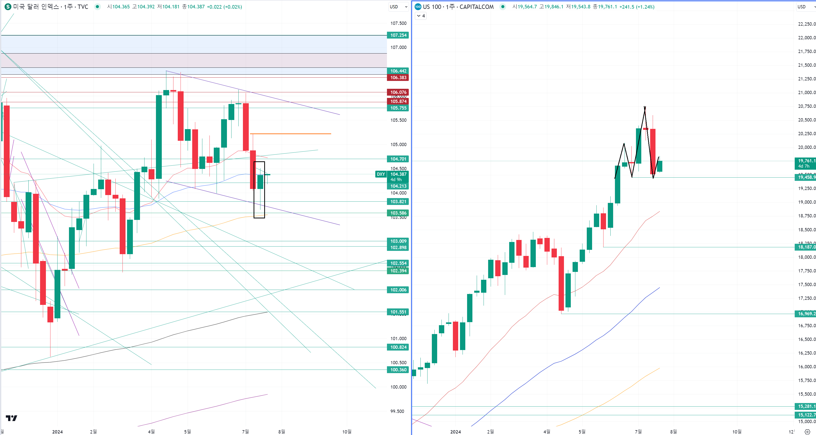 나스닥은 현재 19400 중반의 꼬리 지지선으로 이루어진 넥라인이 있고