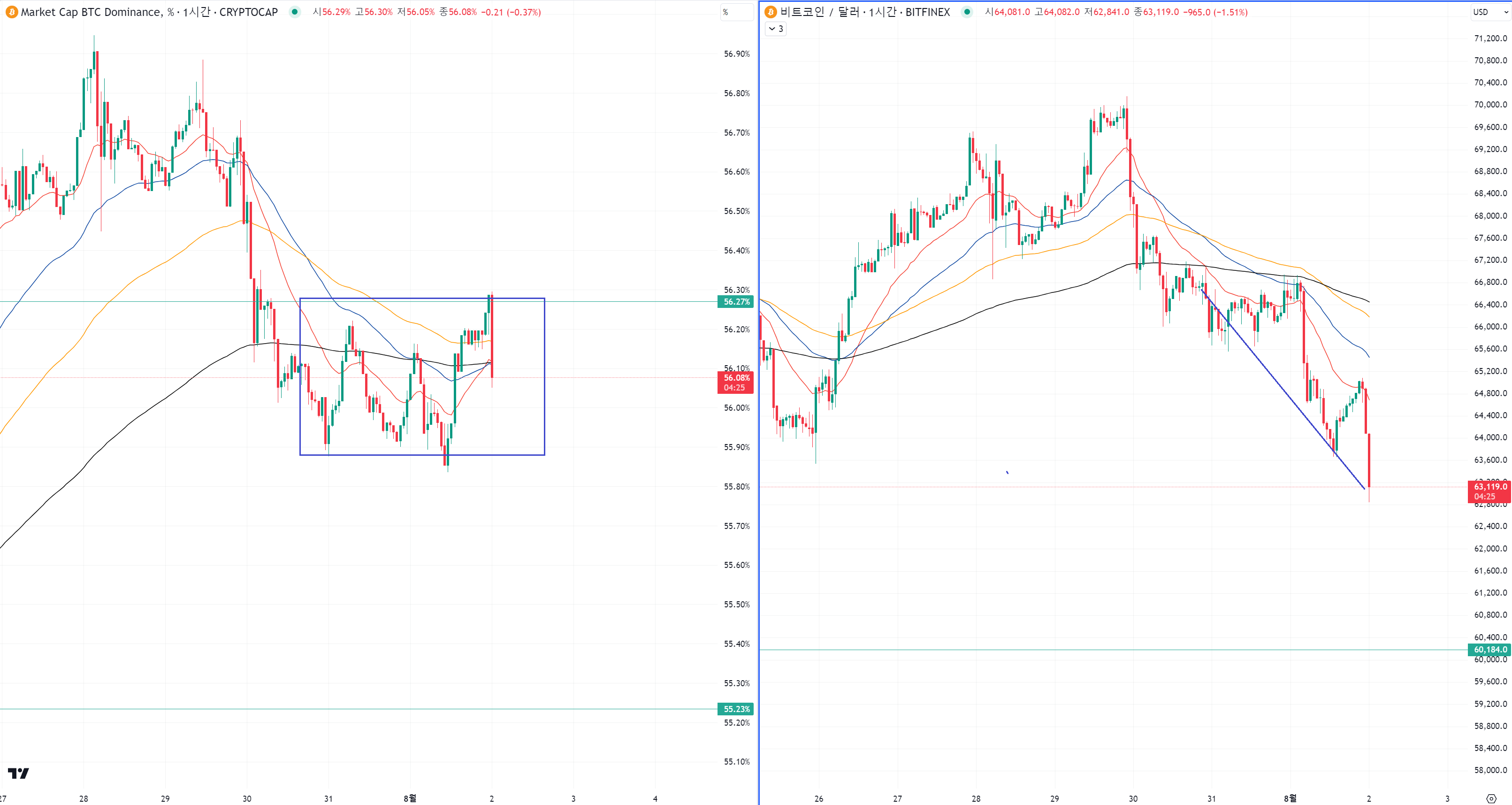 비트코인 장대음봉 하락에서는 도미넌스가 하락했지만