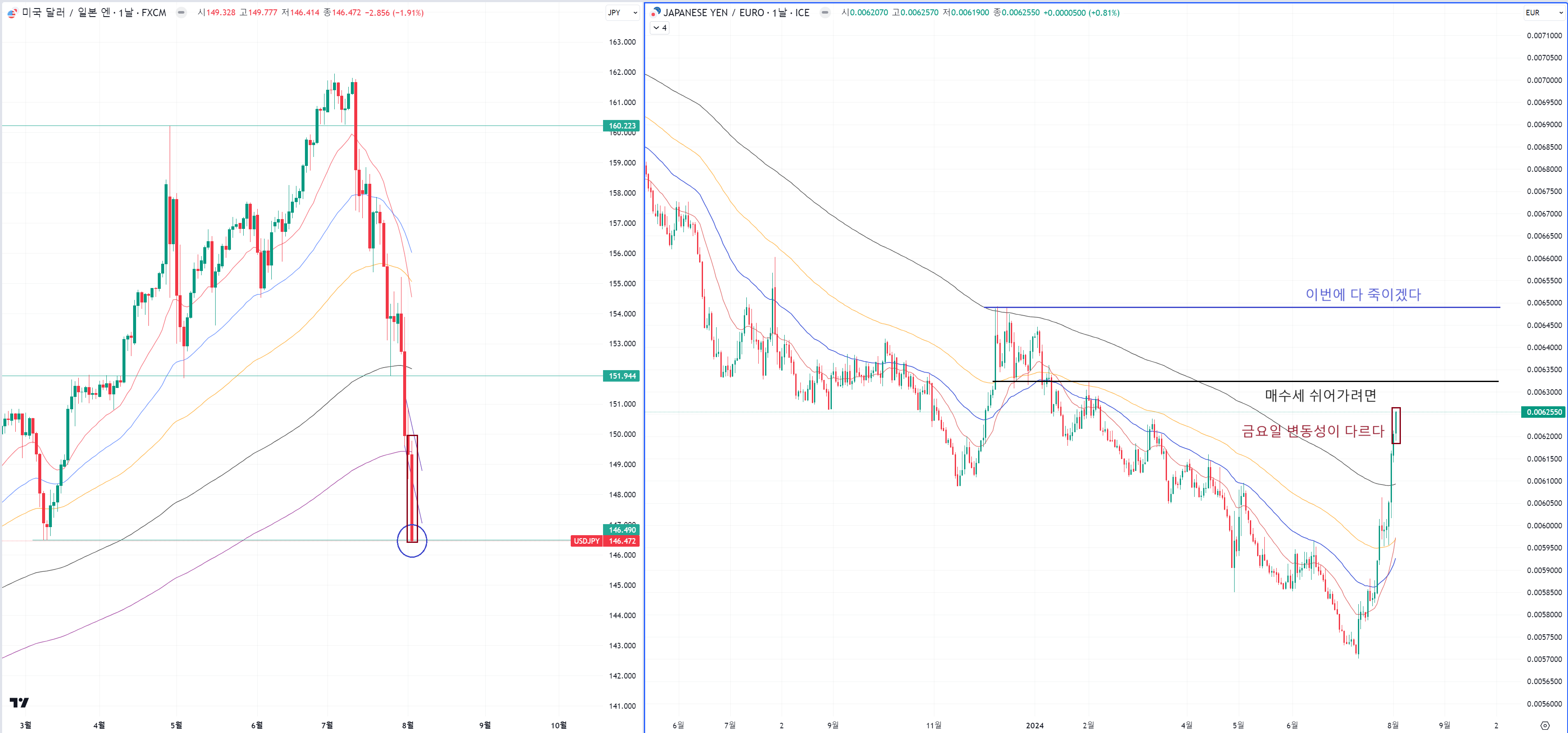 내일 아침부터 엔화 관련 환율 시장에서 갭상승, 하락이 나오는지 체크해야합니다.