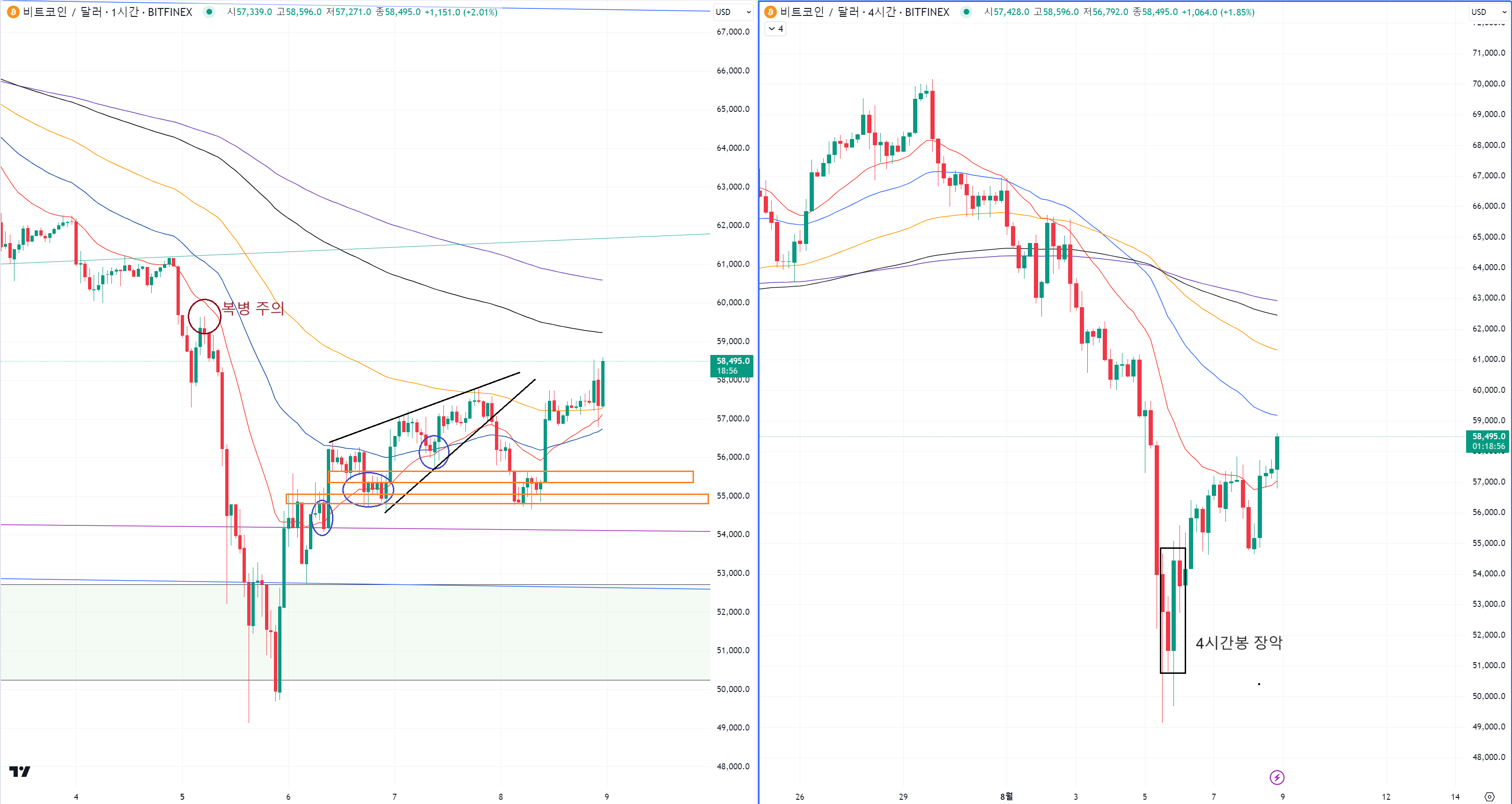 왼쪽은 1시간봉이고 오른쪽은 4시간봉입니다.
