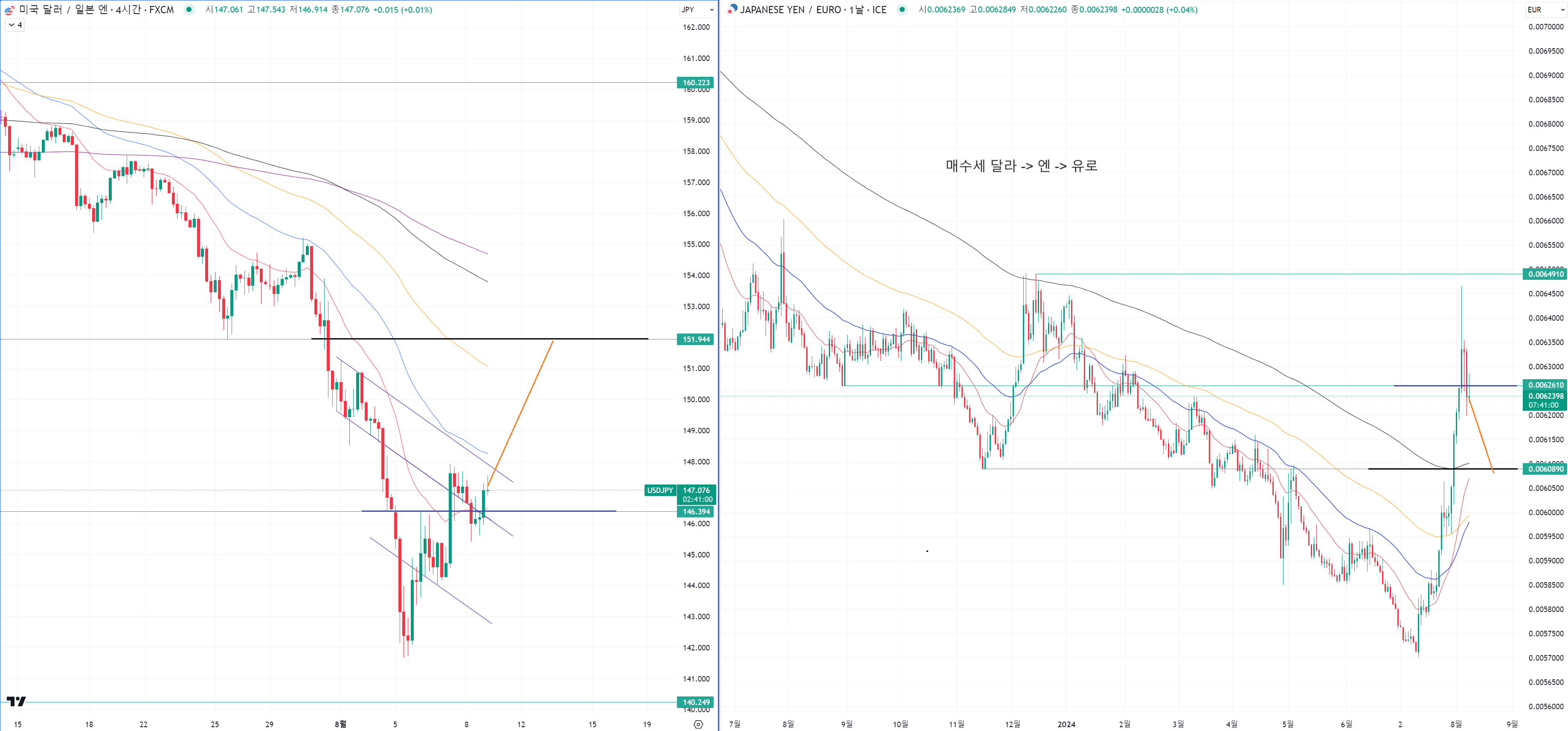 왼쪽은 달라엔 차트이고 오른쪽은 엔유로 차트입니다.