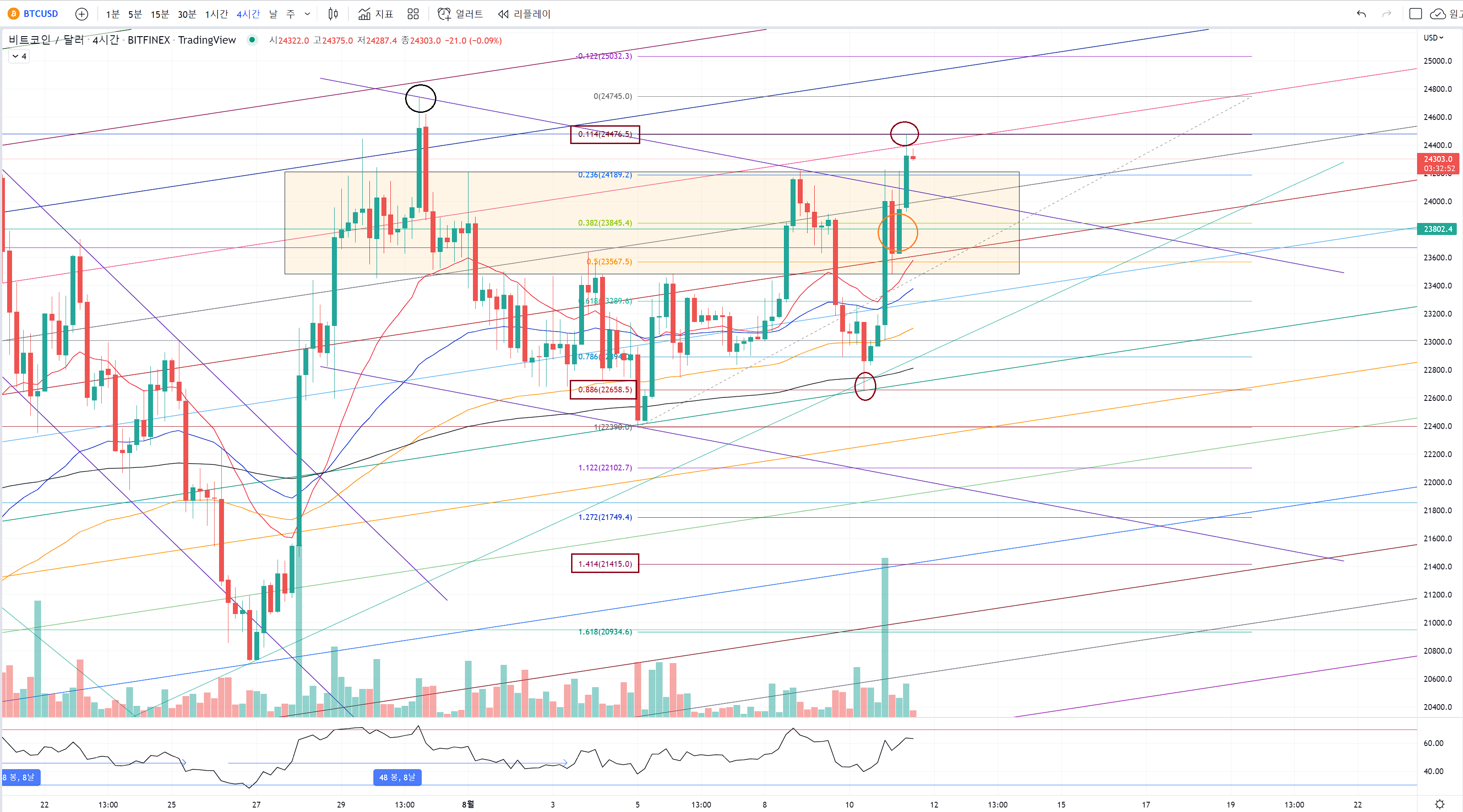 비트코인은 검은색 동그라미로 표시한 7월 말 전고점을 아직고 못 넘어갔습니다.