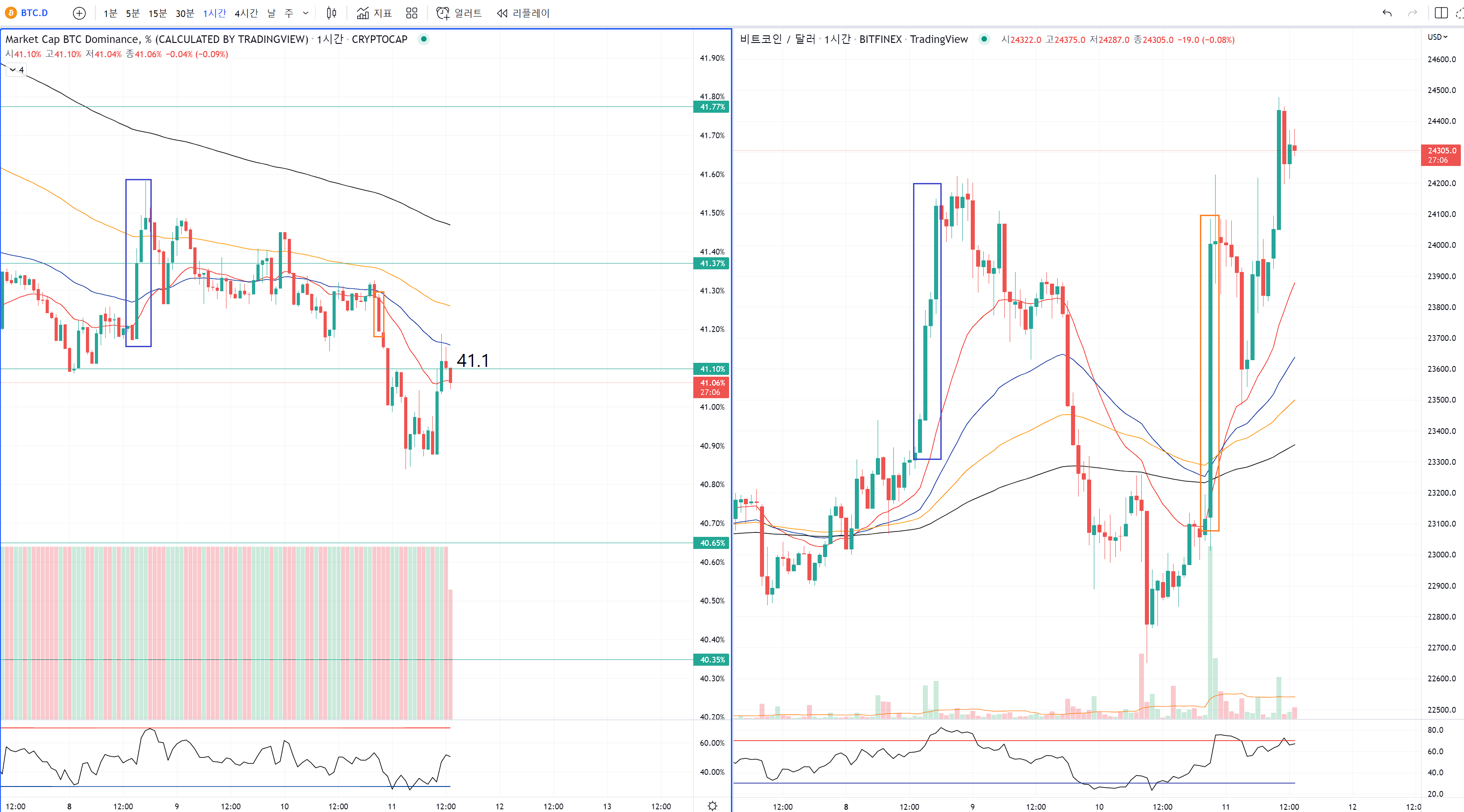 지난번 같은 구간을 장대양봉으로 상승했던 파랑색 구간에서는 도미넌스가 올라갔어요.