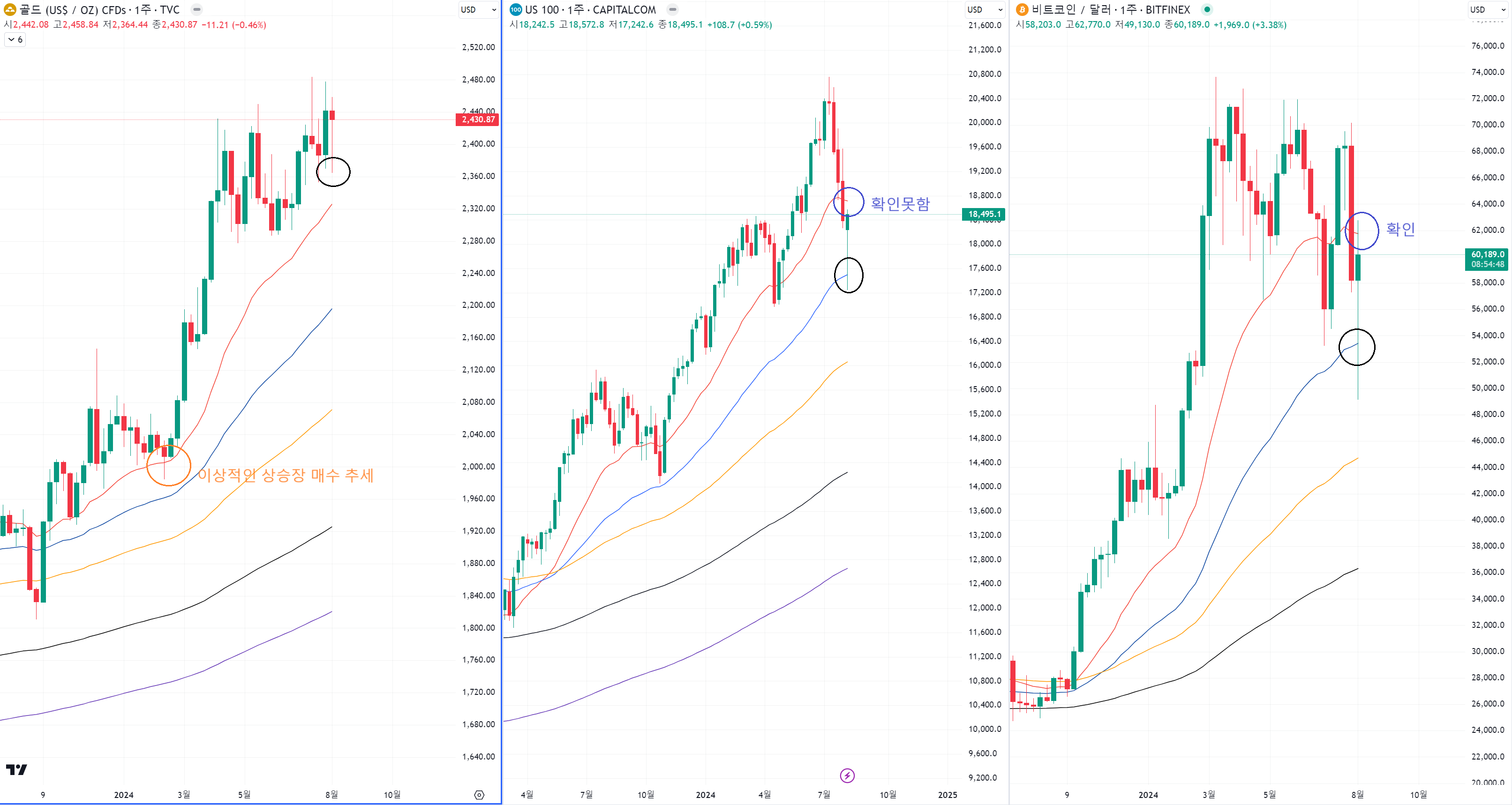 골드의 경우 주황색 동그라미에서 대세상승장의 시작을 알리는 주봉 21일선 지지 확인으로