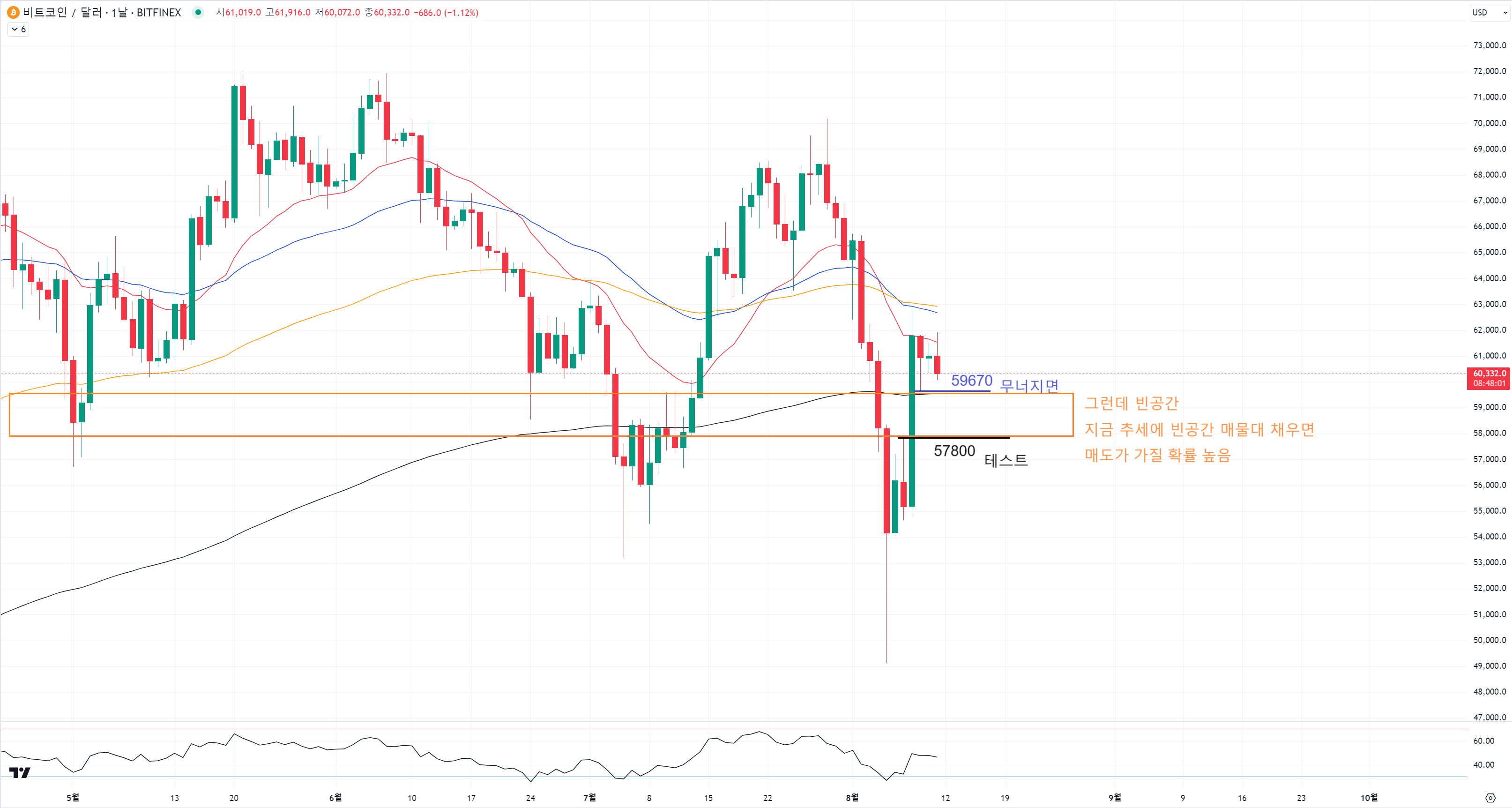 이번주 비트코인의 매도세가 나올때 왼쪽 캔들 윗꼬리의 57800 지지 테스트를 할차례입니다.
