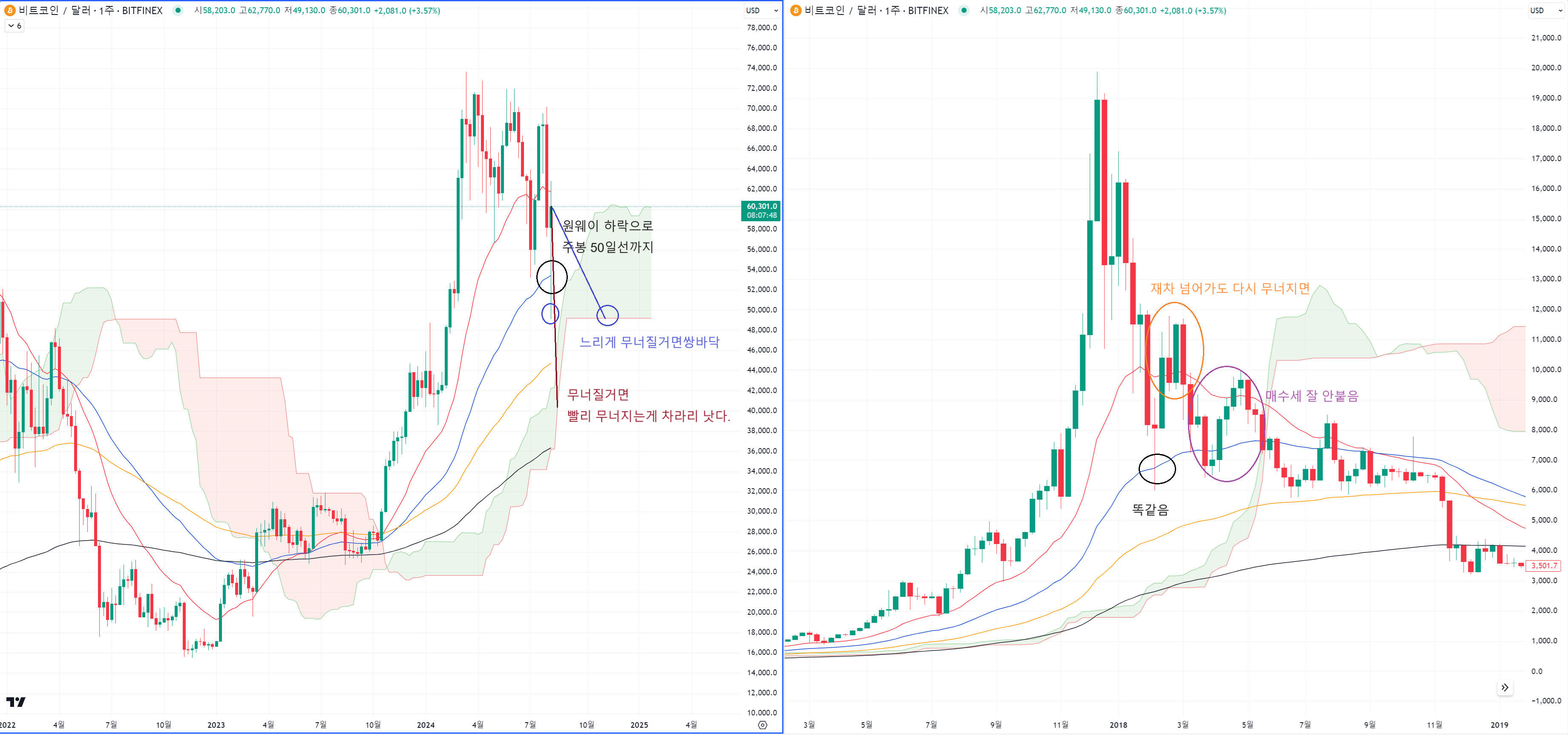 그나마 비트코인의 경우 악랄해져서 그런지 2021년 7월에는 주봉 50일선을 무너뜨리고도