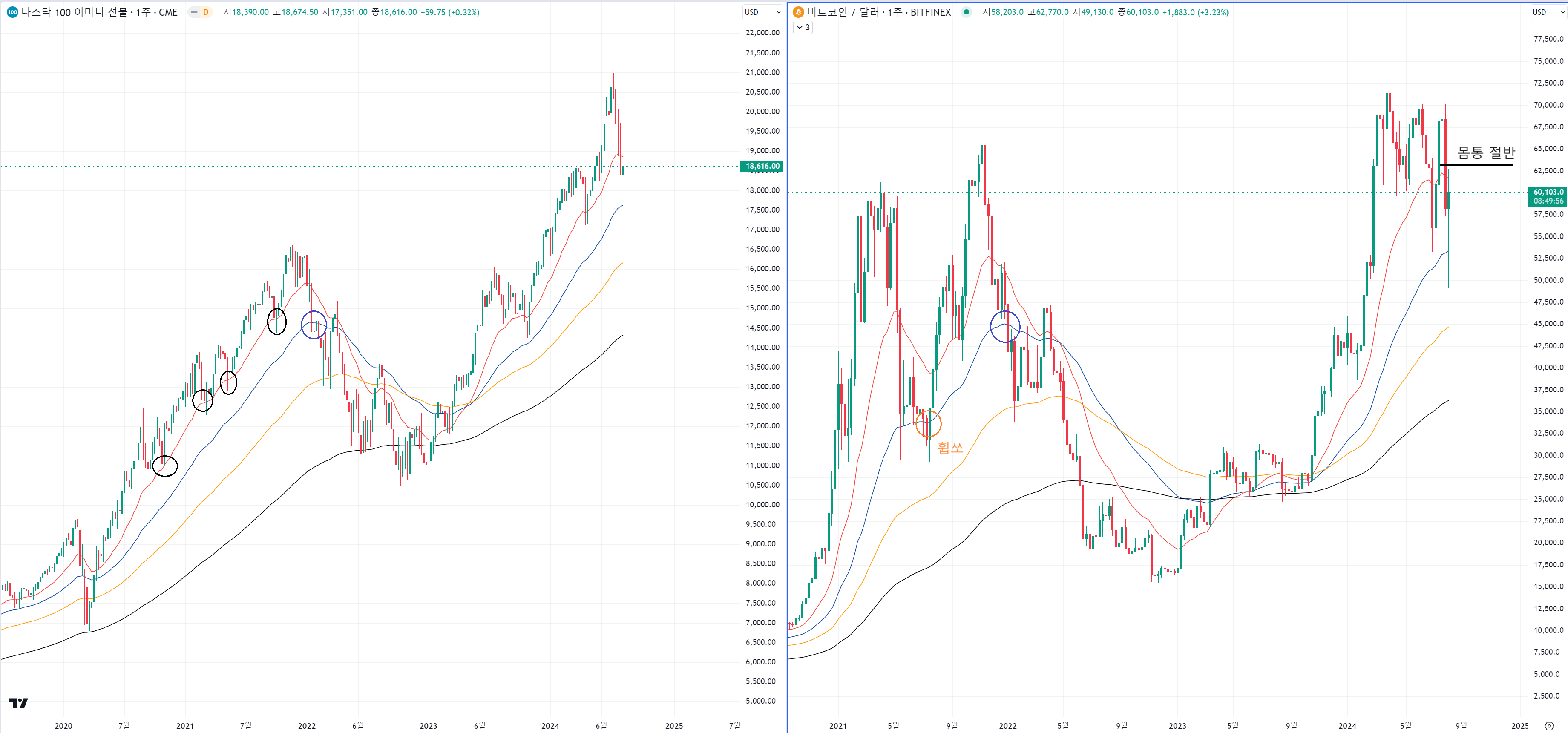 주봉에서 조금 더 보자면 나스닥도 비트코인도 2021년 무렵을 보세요.