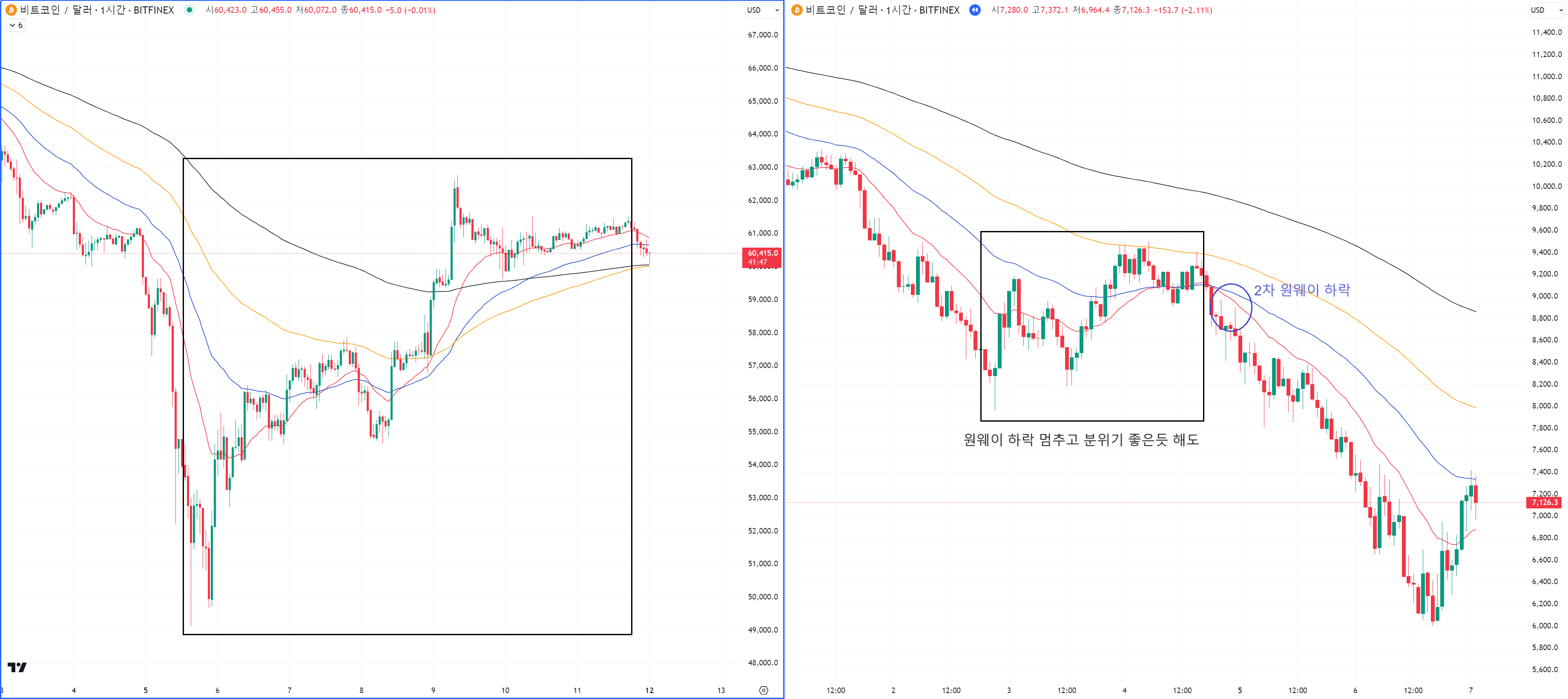 왼쪽은 원웨이 하락의 정석을 보여준 2018년 1월말 2월초 비트코인 차트입니다.