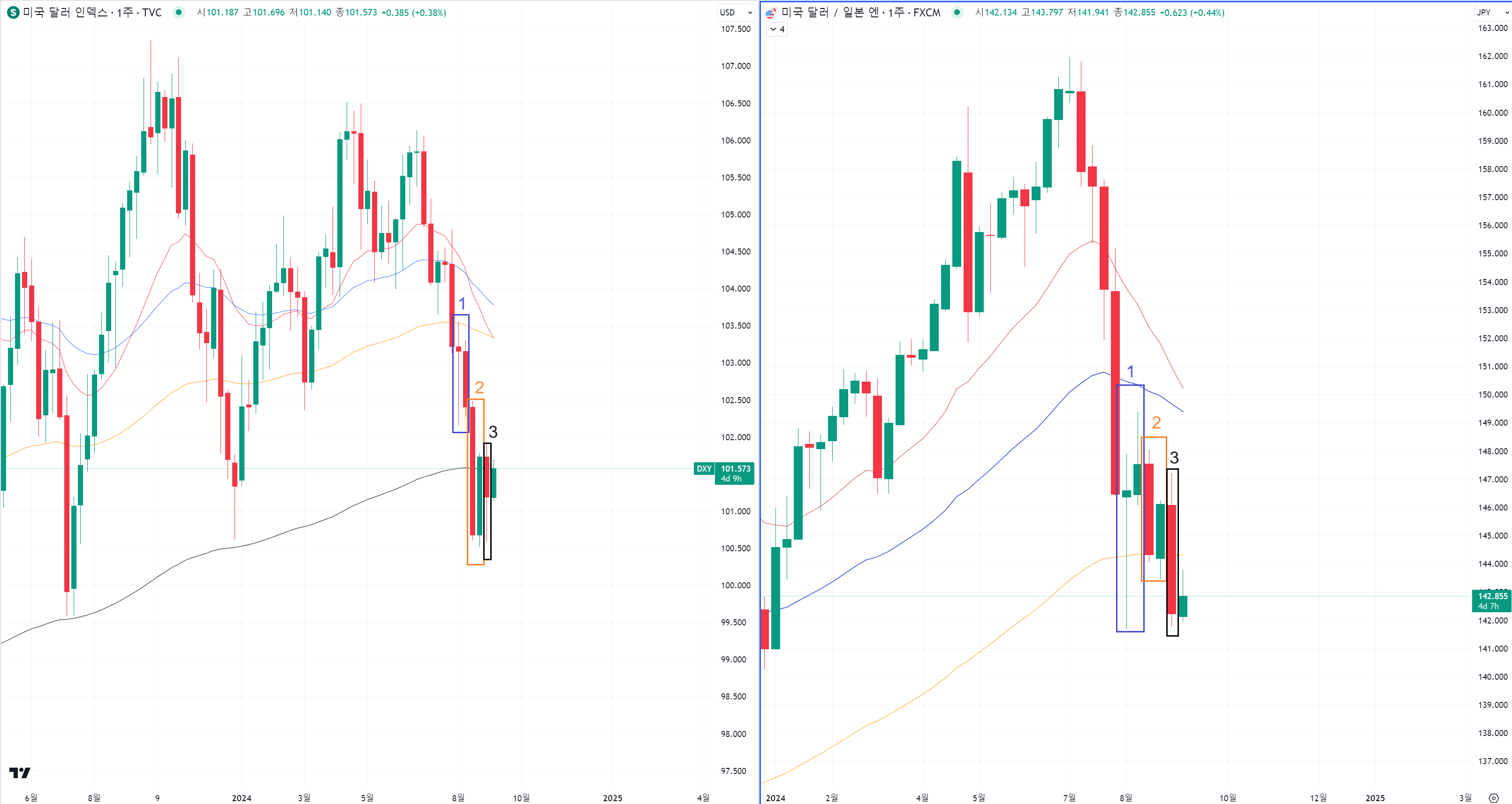 1번 구간은 전세계 돈이 엔화로 몰렸다가 다시 달라로 회수되는 과정이었습니다.