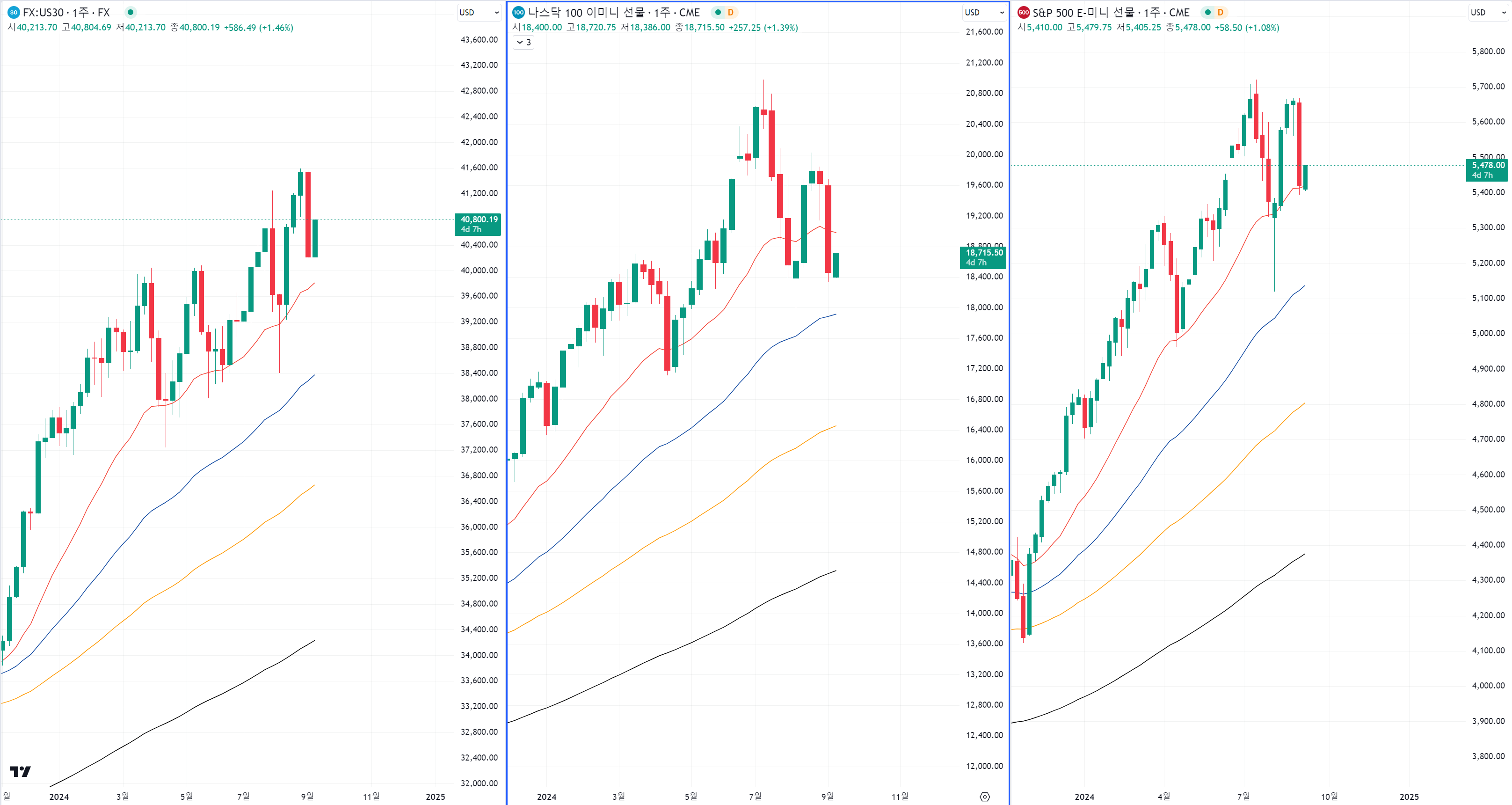 다우나 S&P는 주봉으로 봐도 21일선 지켜주기 위한 매수세 들어오기 좋고