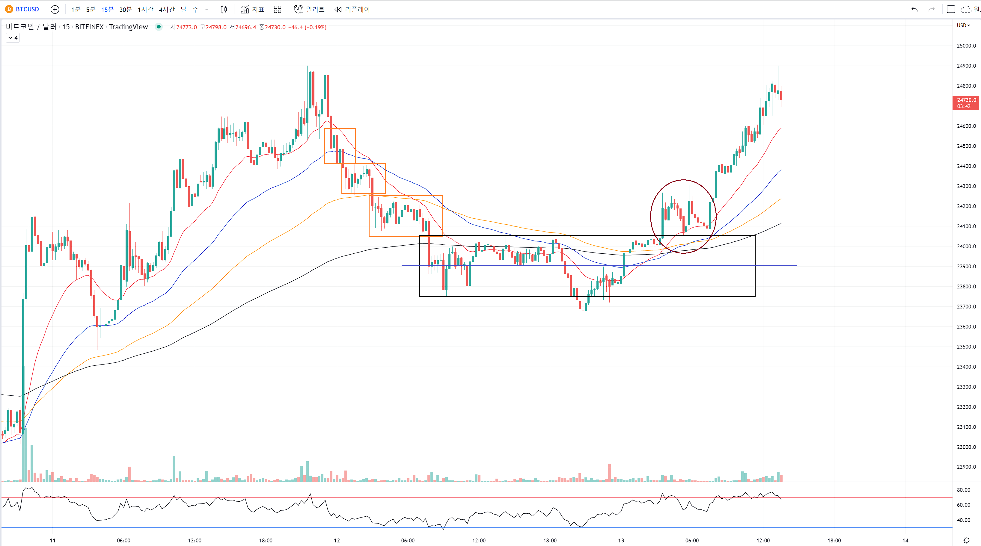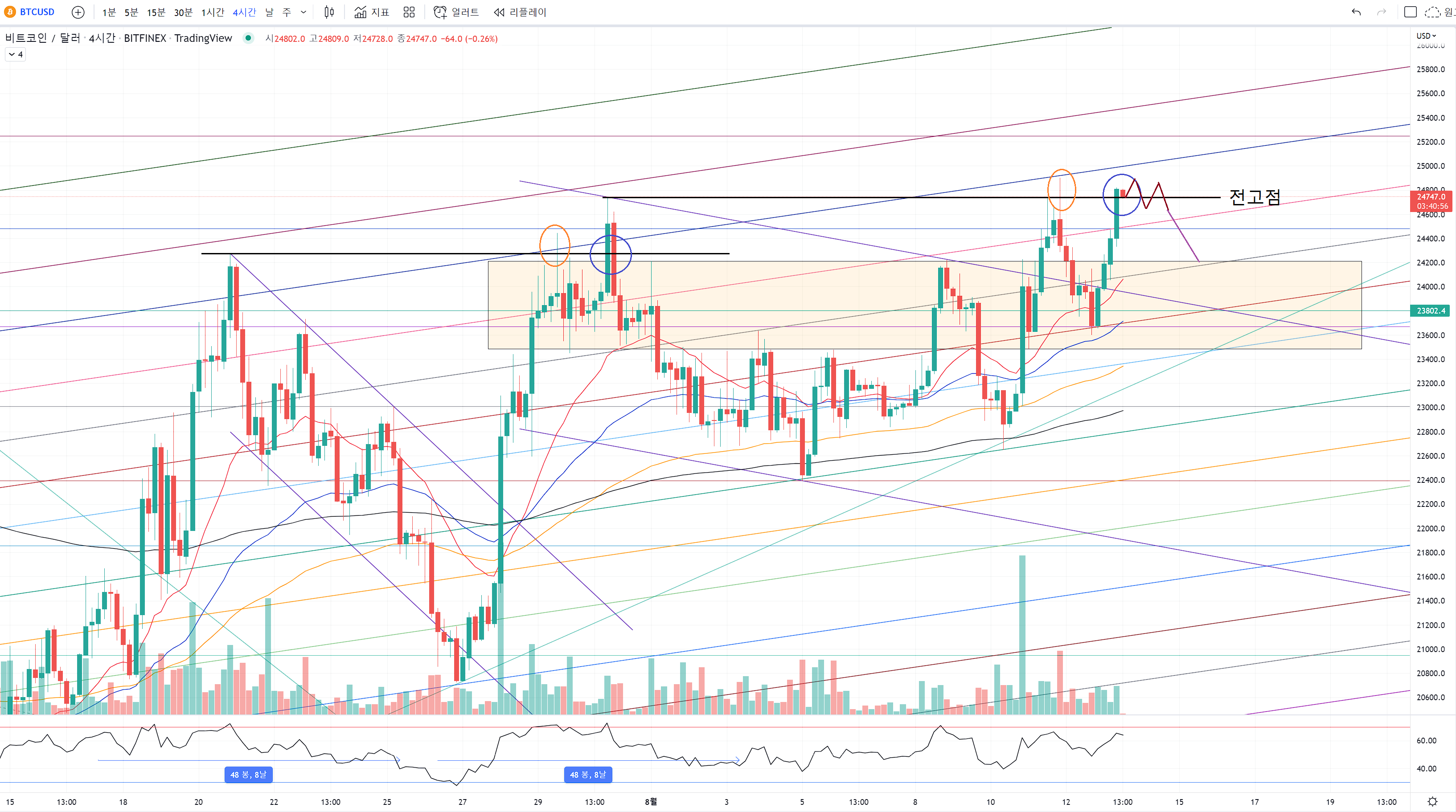 그리고 추세선 저항을 받고서 조정이 왔을때 파랑색을 지지구간으로 활용해서 버텨줬어요.