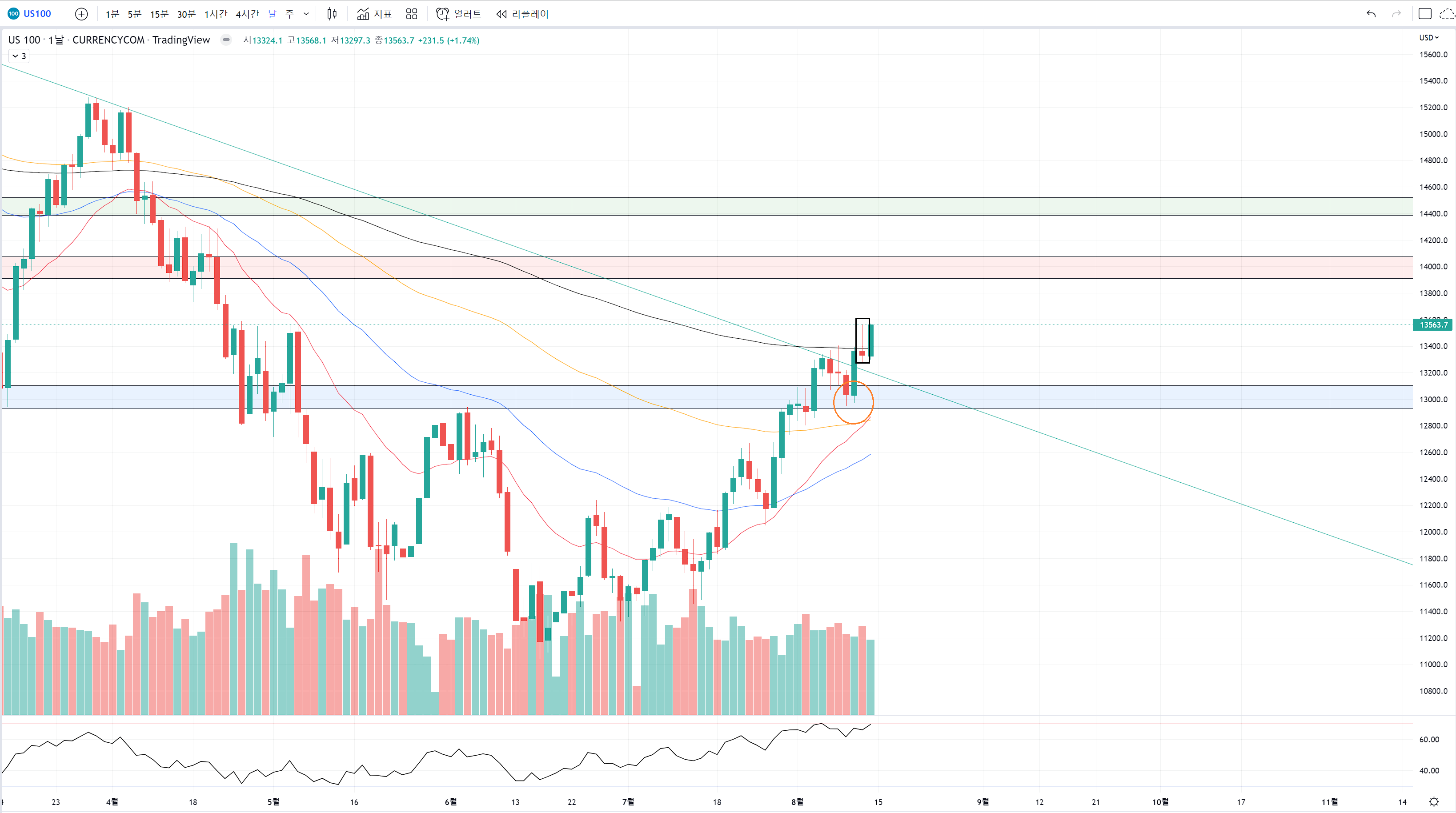 나스닥은 추세선 돌파하기 전에 12900~13100 파랑색 저항구간을 돌파했습니다.