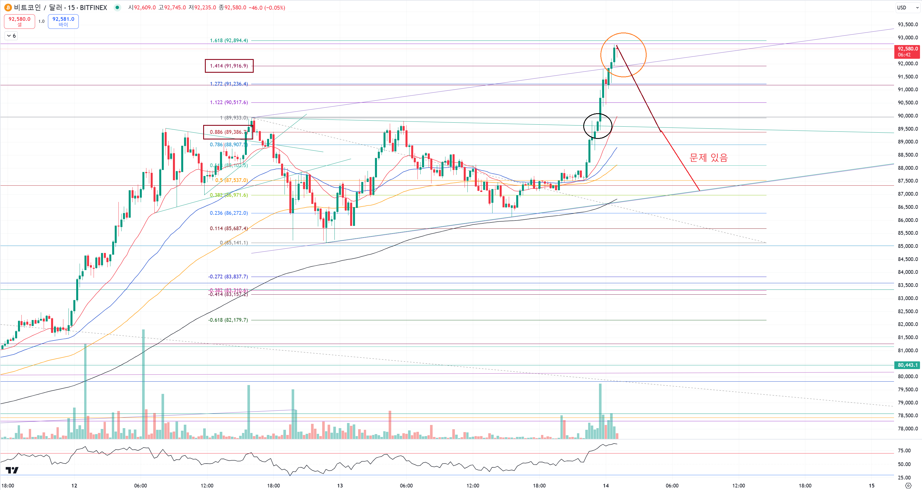 주황색동그라미처럼 추세선 무너뜨리는 상황에서 1.414선이 무너지게 되니