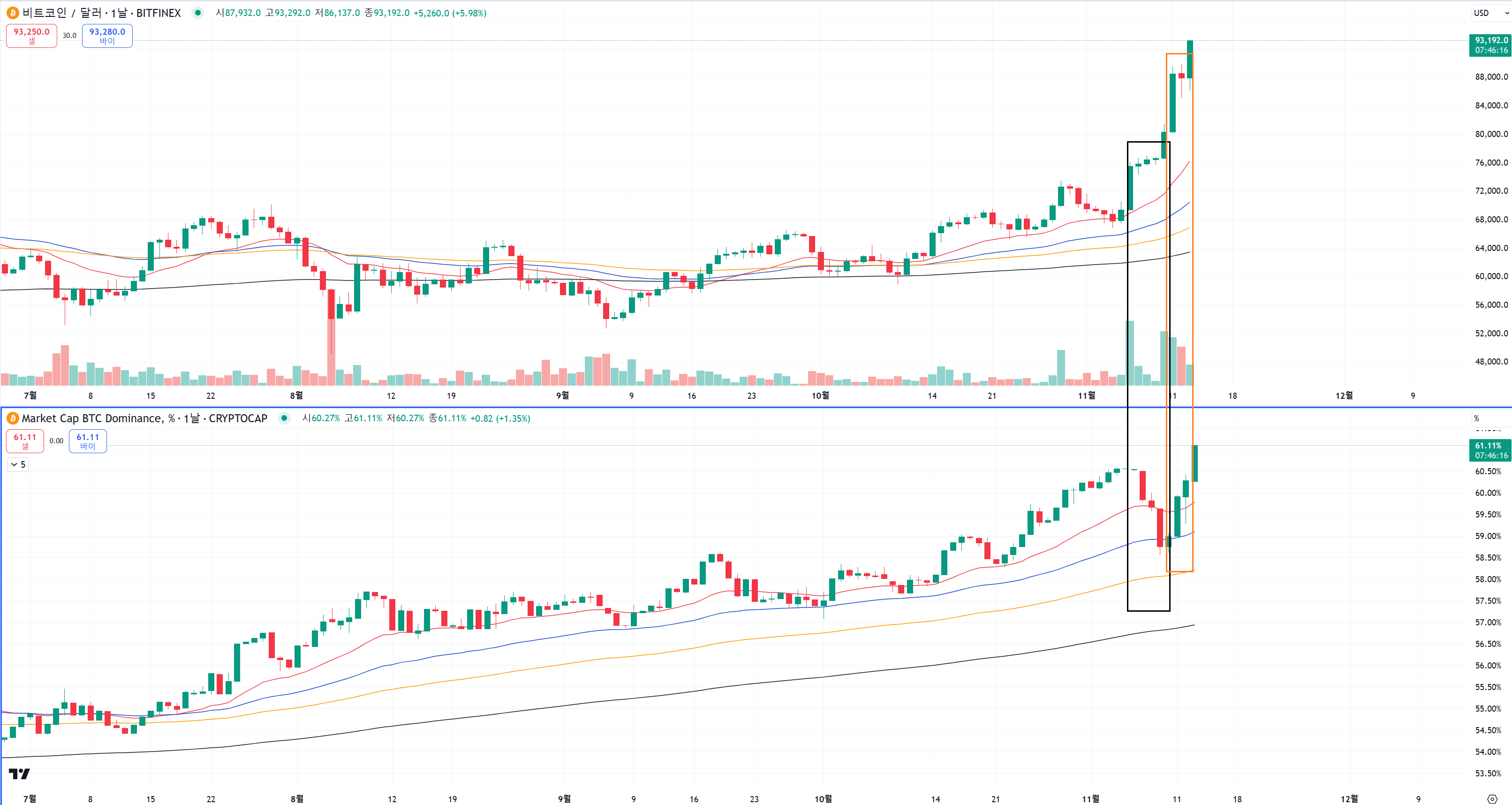 일단 비트코인 모습만 보면 주황색상황이 비슷해요.