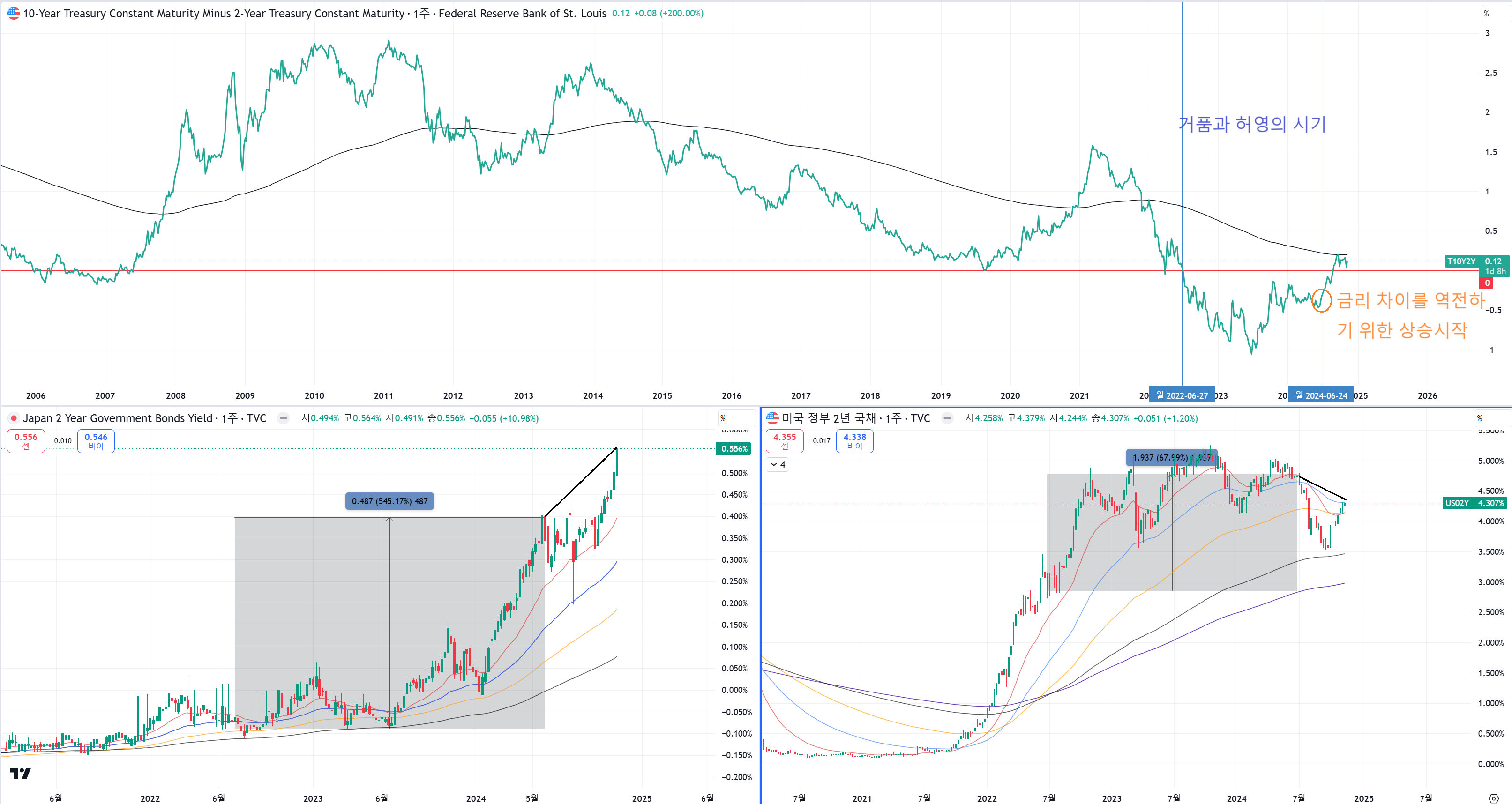 10년 2년물 금리차이 / 일본 2년물 채권금리 / 미국 2년물 채권금리