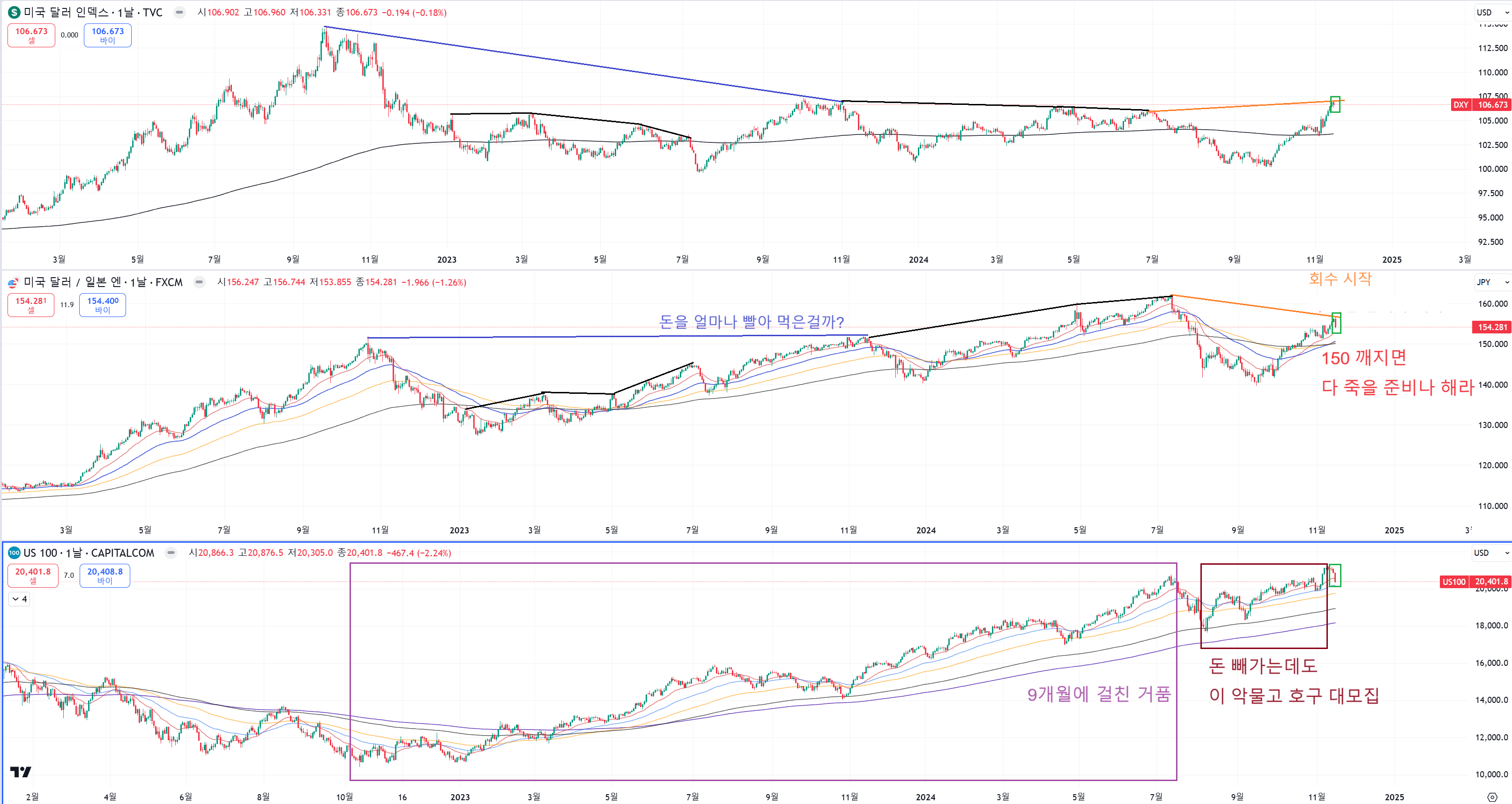 초록색은 금요일 일봉의 모습이고 노골적으로 돈이 엔화로 빠져나가면서 미국 증시에서 하락이 온 모습입니다.