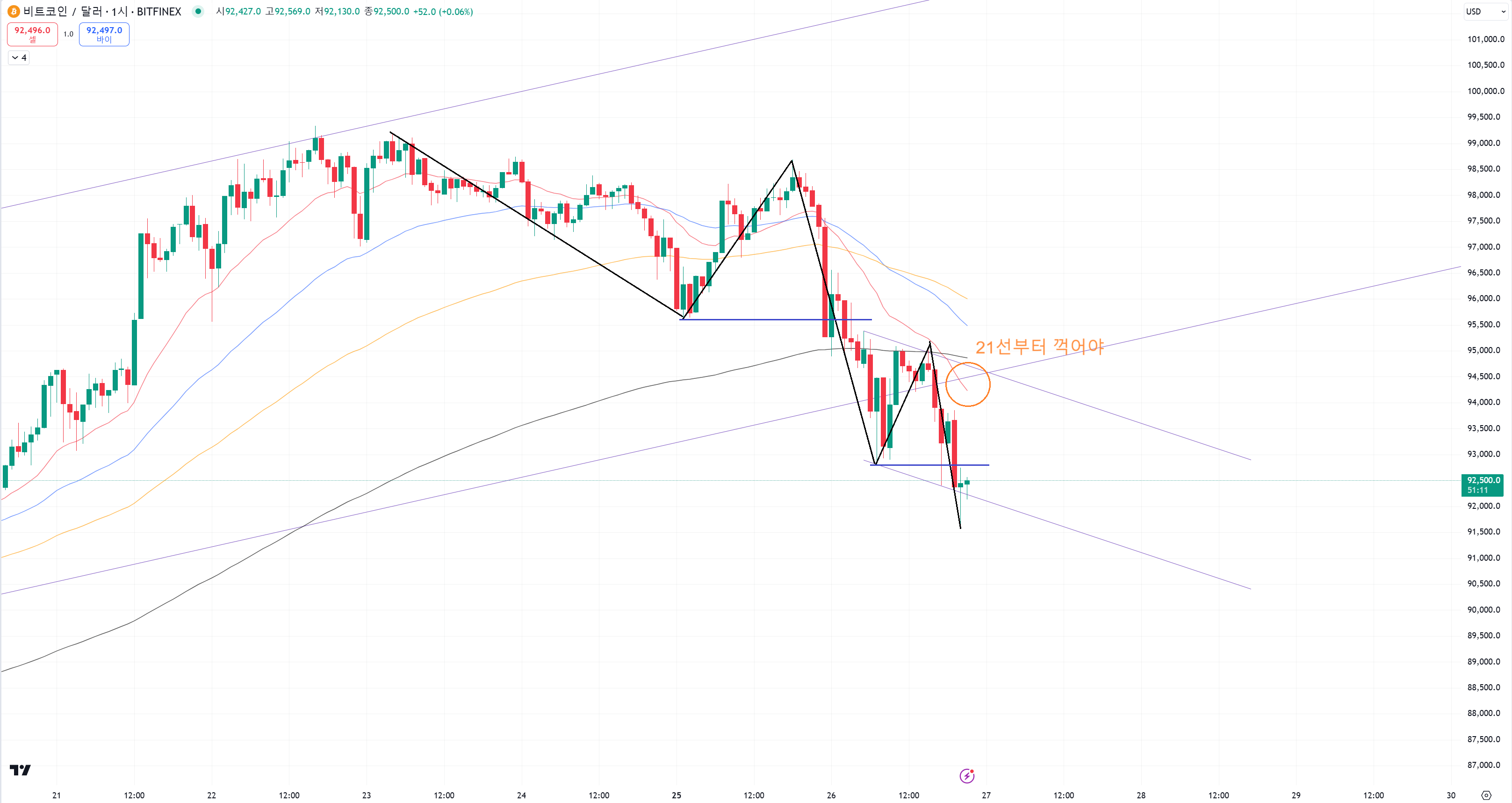 당장은 1시간봉 21일선에 저항받고 원웨이 하락으로 갈지 말지를 지켜봅니다.