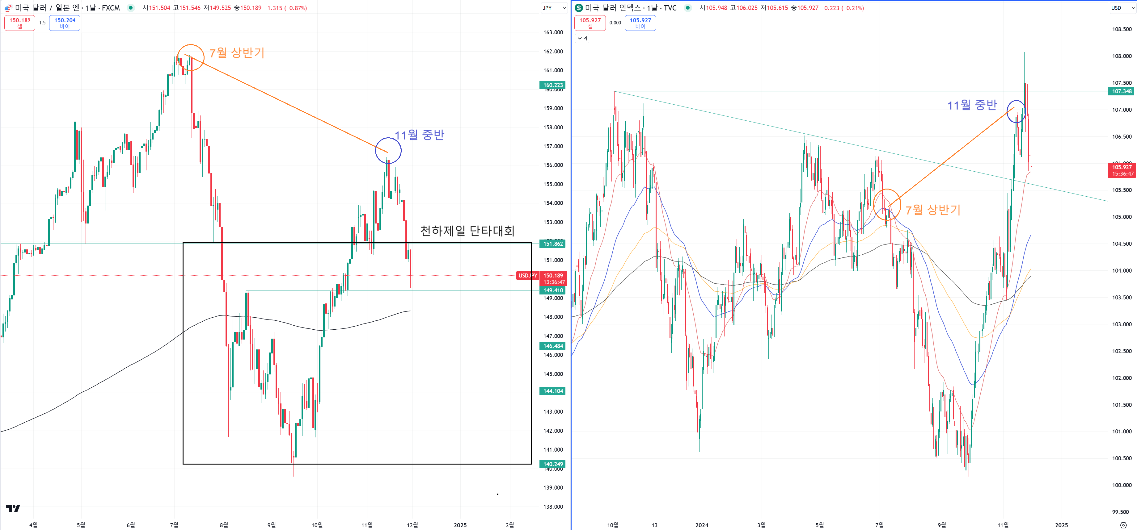 엔화는 고점을 낮출때 달라인덱스는 고점을 높였는데