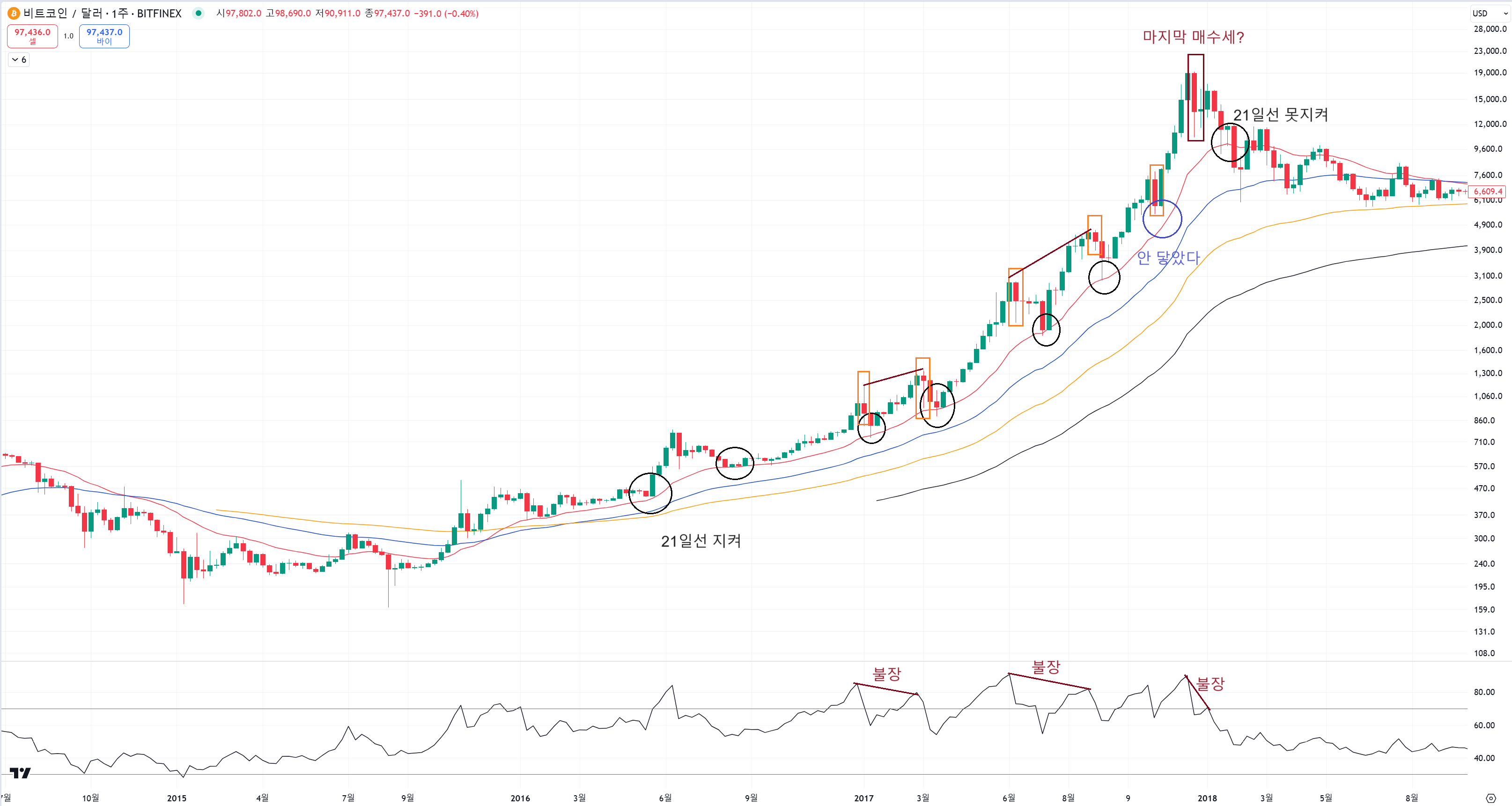 먼저 비트코인 미친 매수세의 끝에서는 신고점 이후 주봉 캔들이 음봉이 떠도