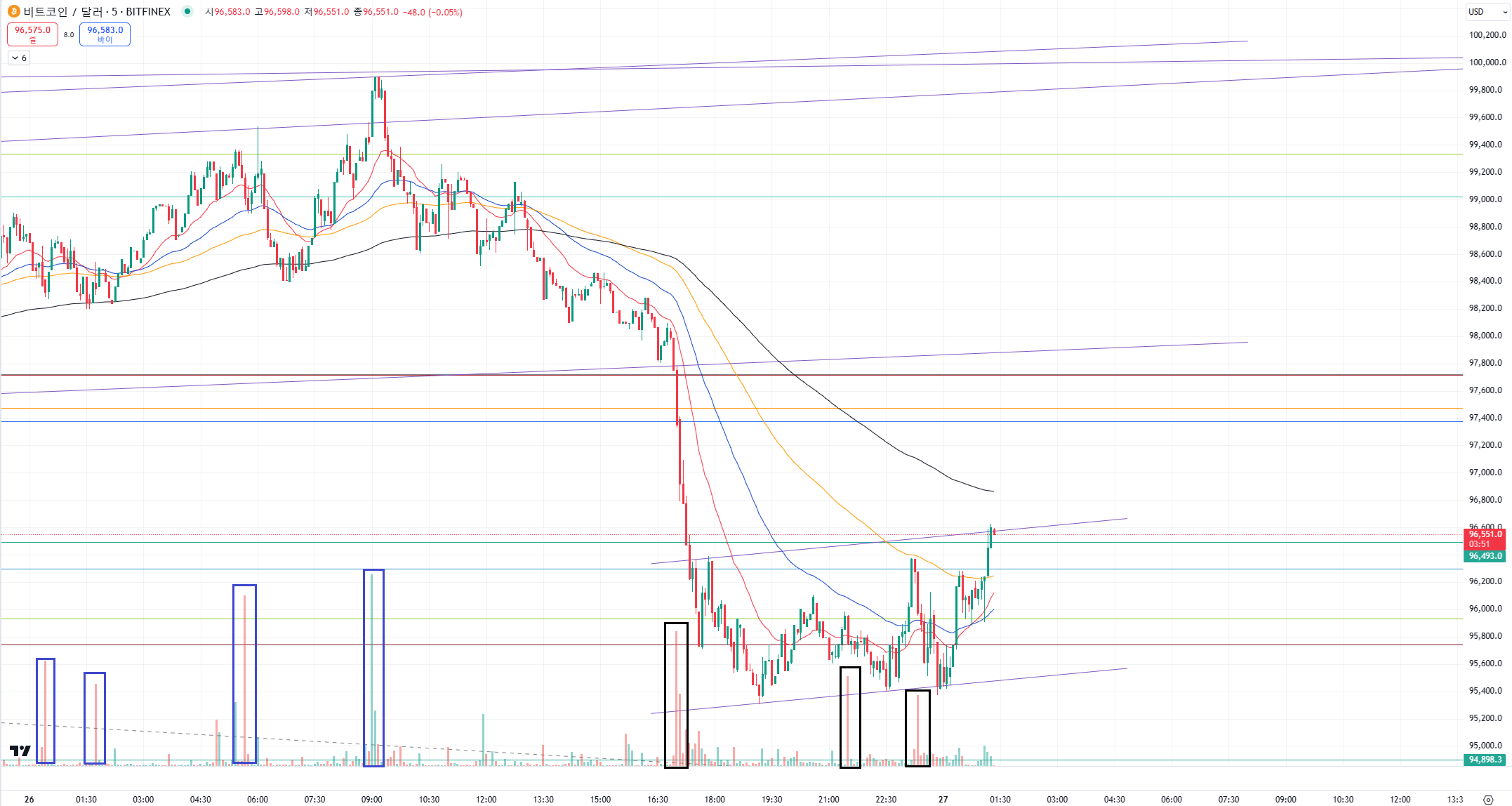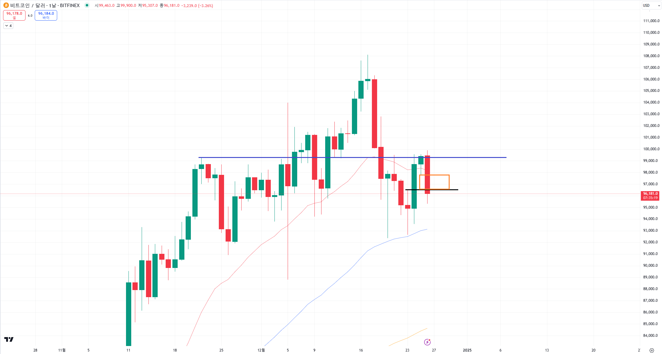 일봉 단위에서보면 오늘 당장 중요한것은 검은색선인 96500을 지켜주는 것입니다.