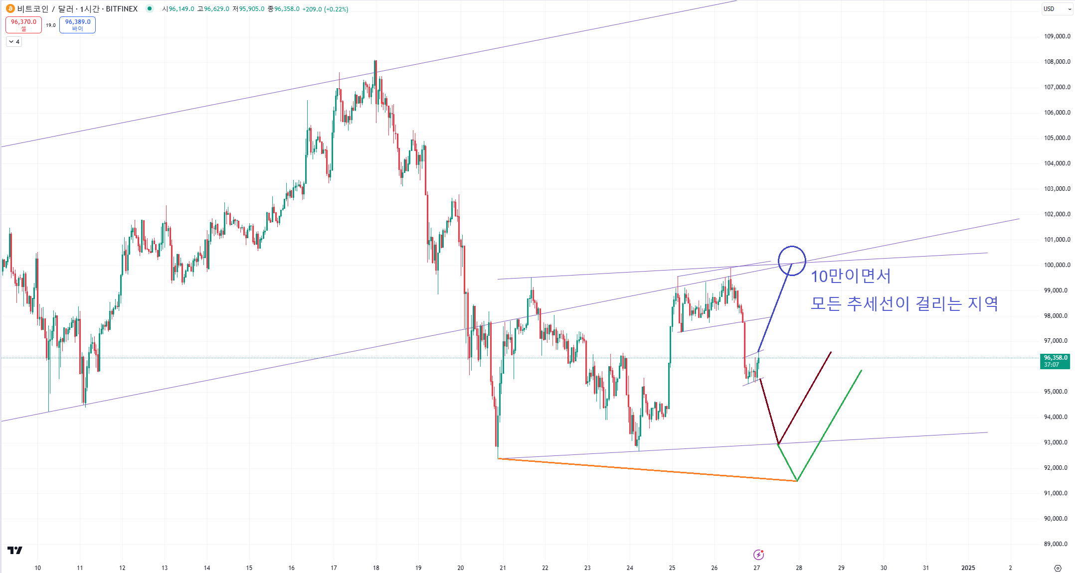 이번 파랑색선처럼 고점갱신을 노리러 가면 10만이 다시 한번 중요해집니다.