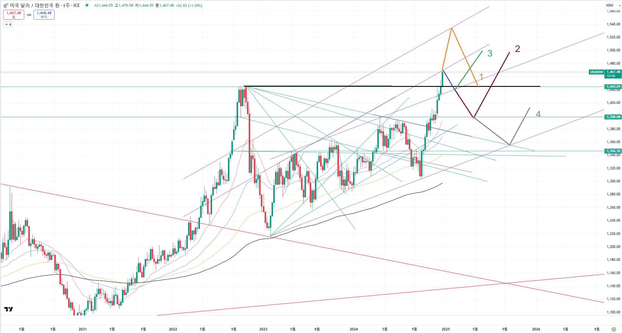 일단 지금 위치가 평행채널과 함께 추세선들이 겹치는 저항 구간입니다.