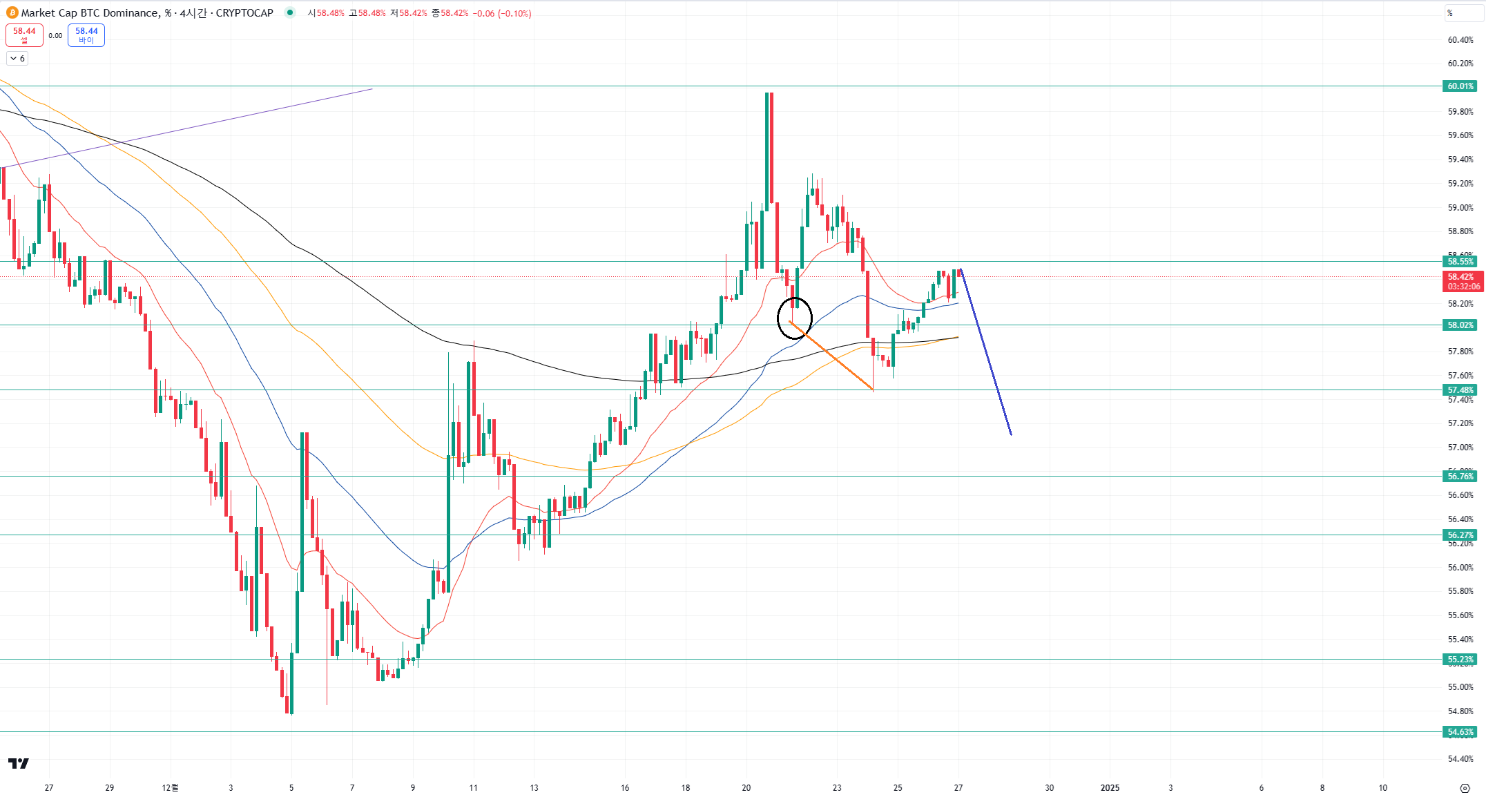 58.5 저항 확정이 잘 나오면 좋겠습니다.